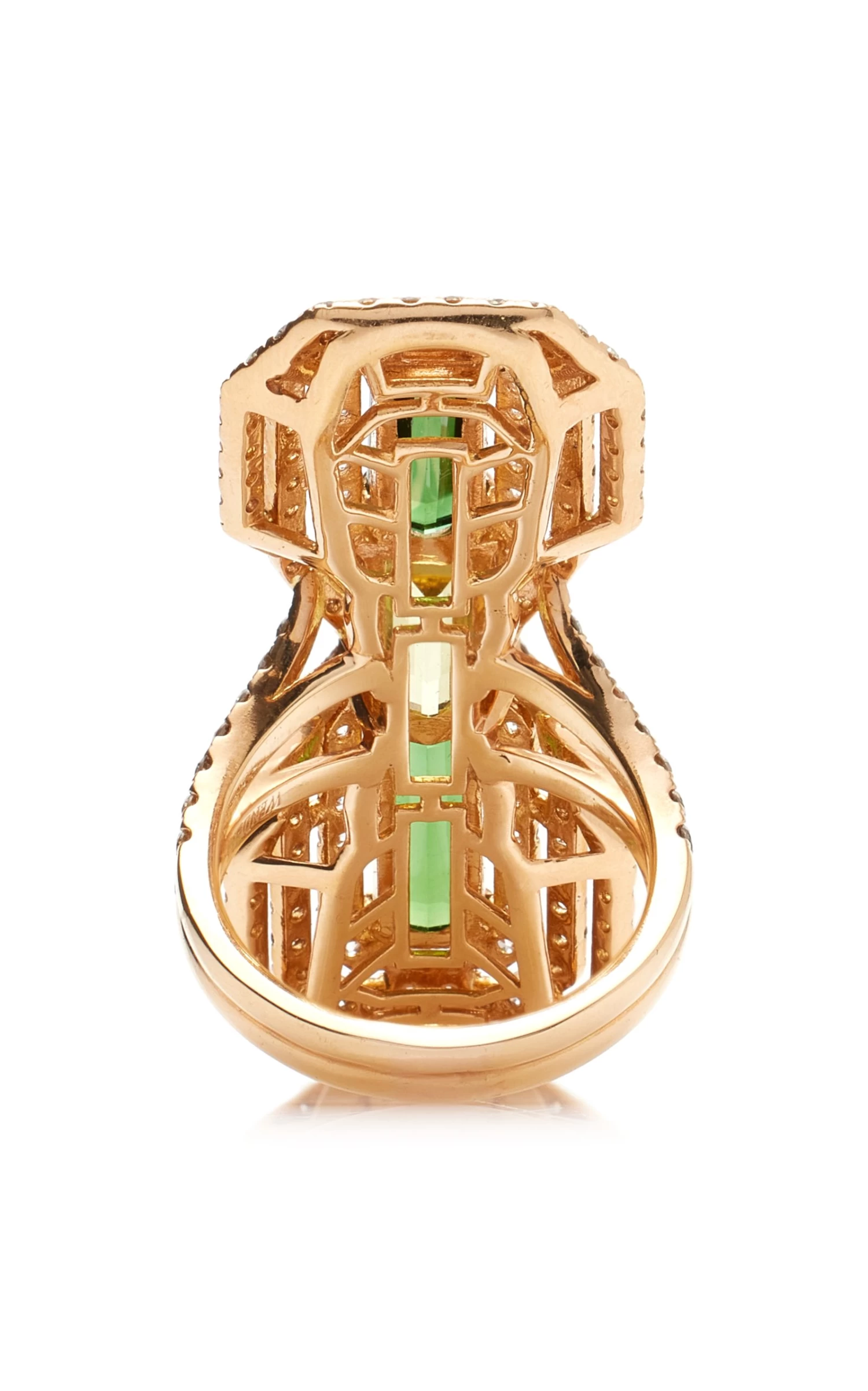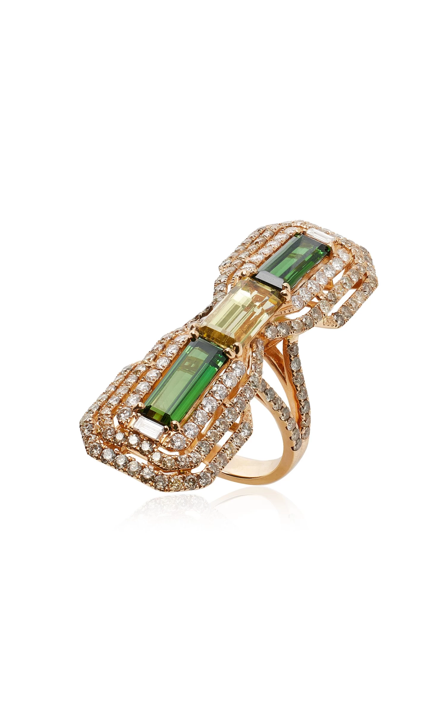 Cast from 18k rose gold, this ‘Longing’ ring features multiple stones including green tourmaline, yellow beryl and diamonds. Wear yours with a halter dress in a neutral hue.
