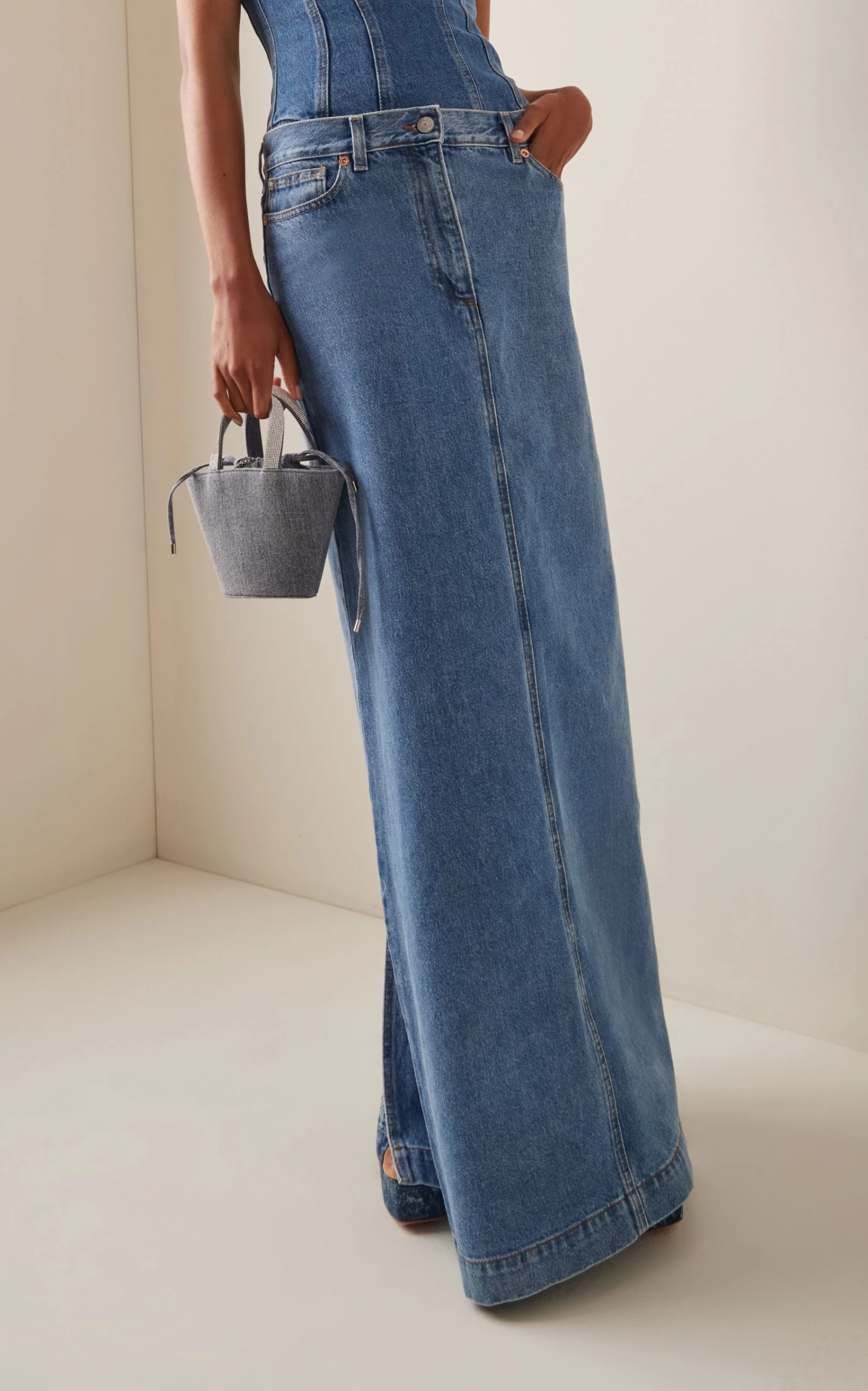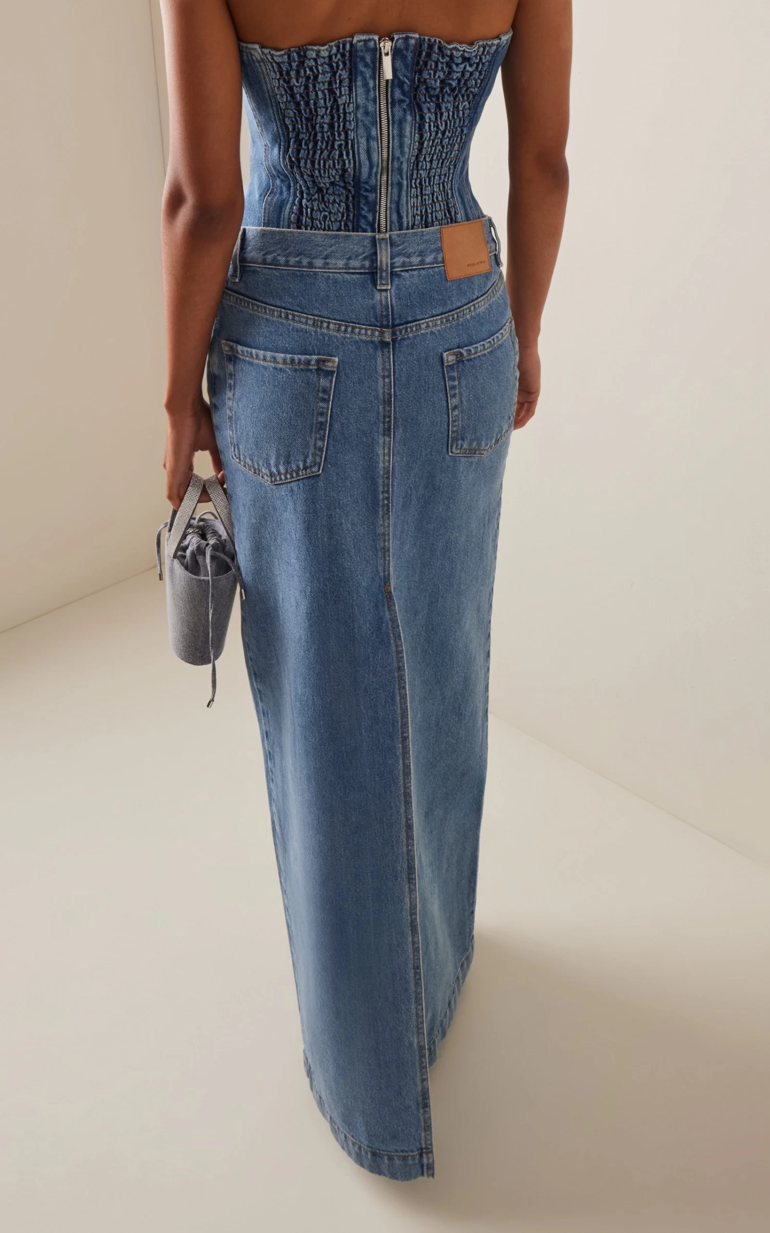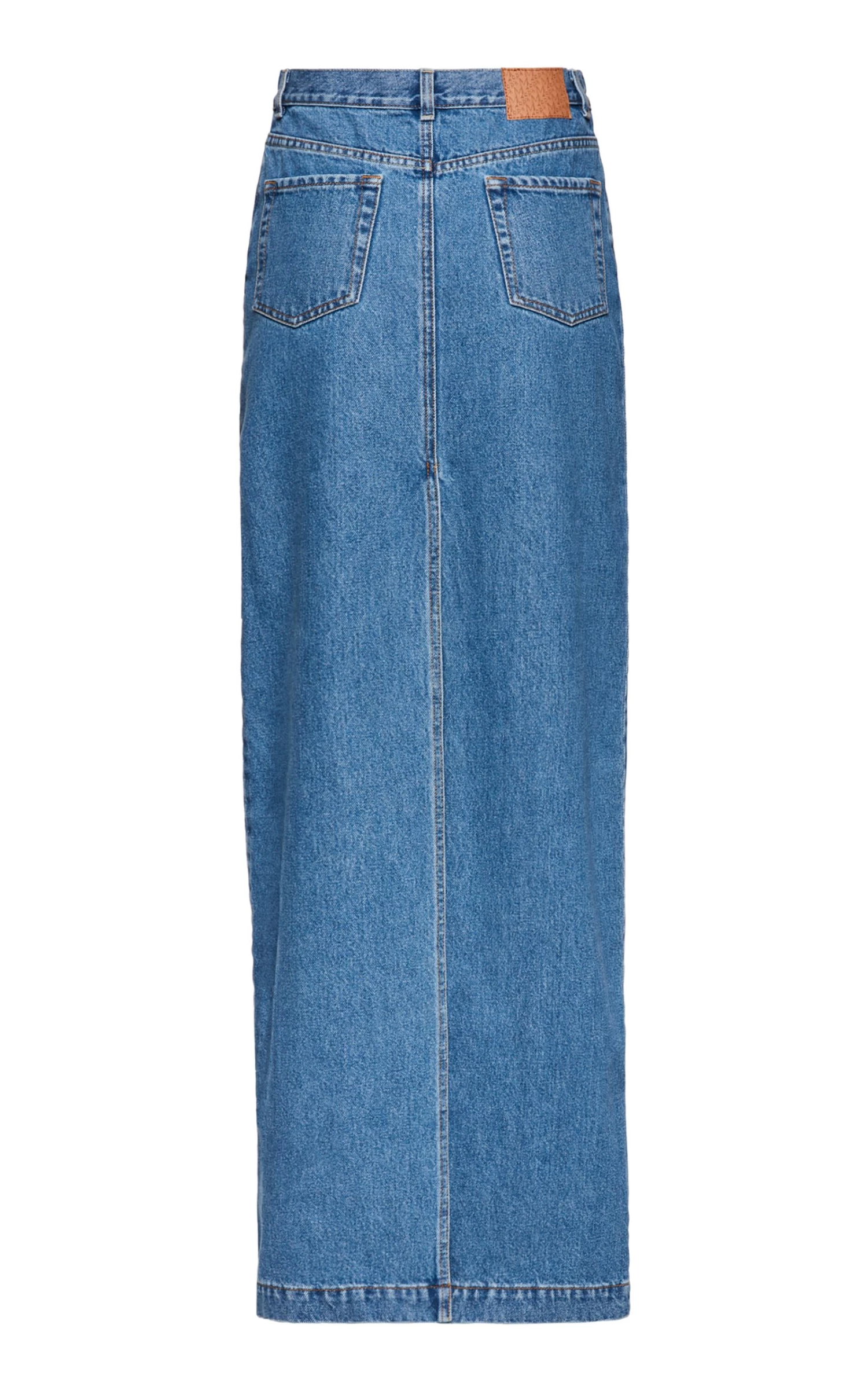 Cut from 100% cotton denim, this skirt falls to a midi hem and has a medium wash finish with a five pocket construction. Pair with leather boots and a white tee for a cool day look.