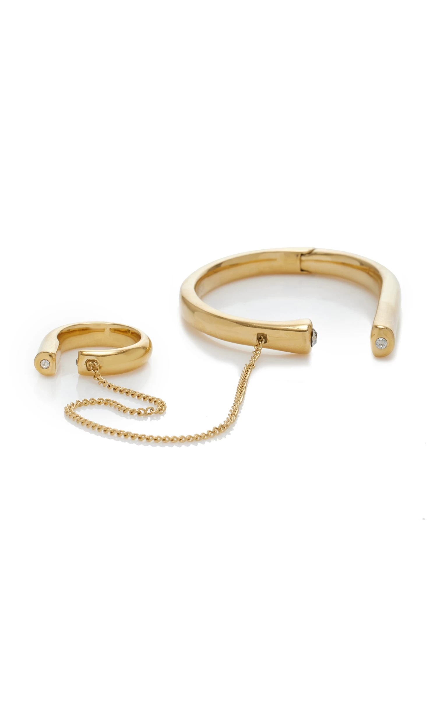 Cast from 12k gold-plated brass, the ‘Marlo’ ring is connected to a matching wrist cuff — also tipped with crystals.