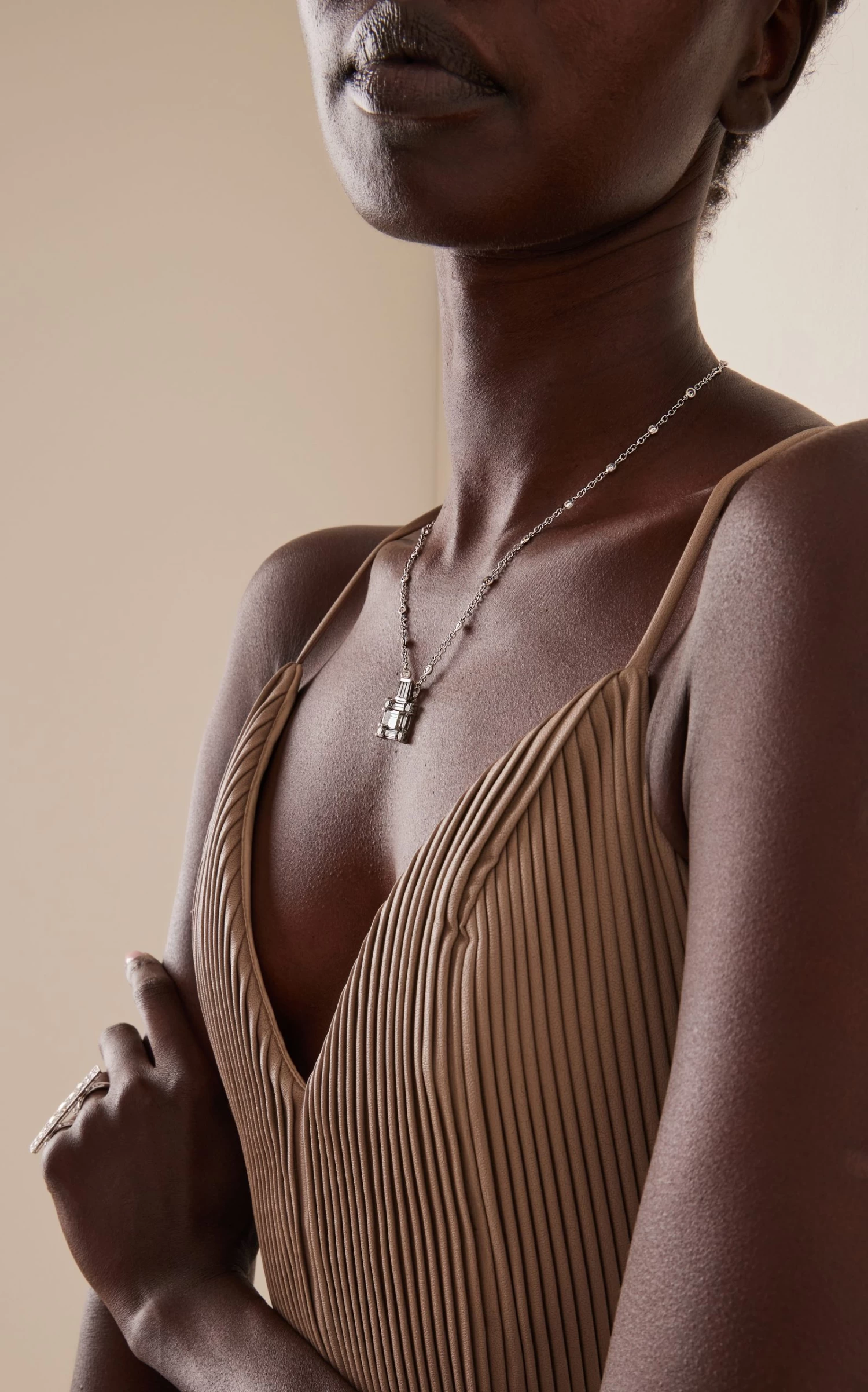 Designed to be incredibly versatile and undeniably stylish, Mindi Mond’s ‘Clarity’ collection is full of modern masterpieces that will become part of your everyday uniform. This ‘Mega’ necklace has been handcrafted in the US from 18k white gold into an 18″ diamond chain strung with a diamond-encrusted cube pendant. Style yours with the other equally stunning pieces from this line.