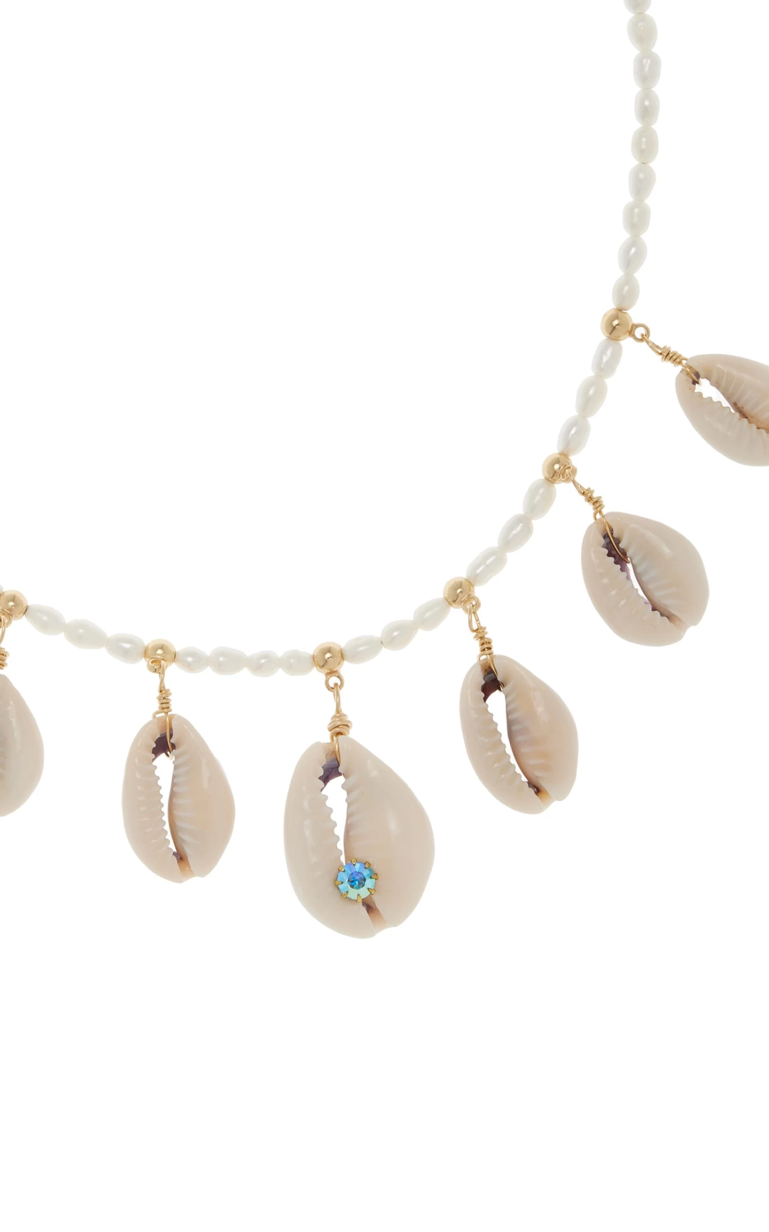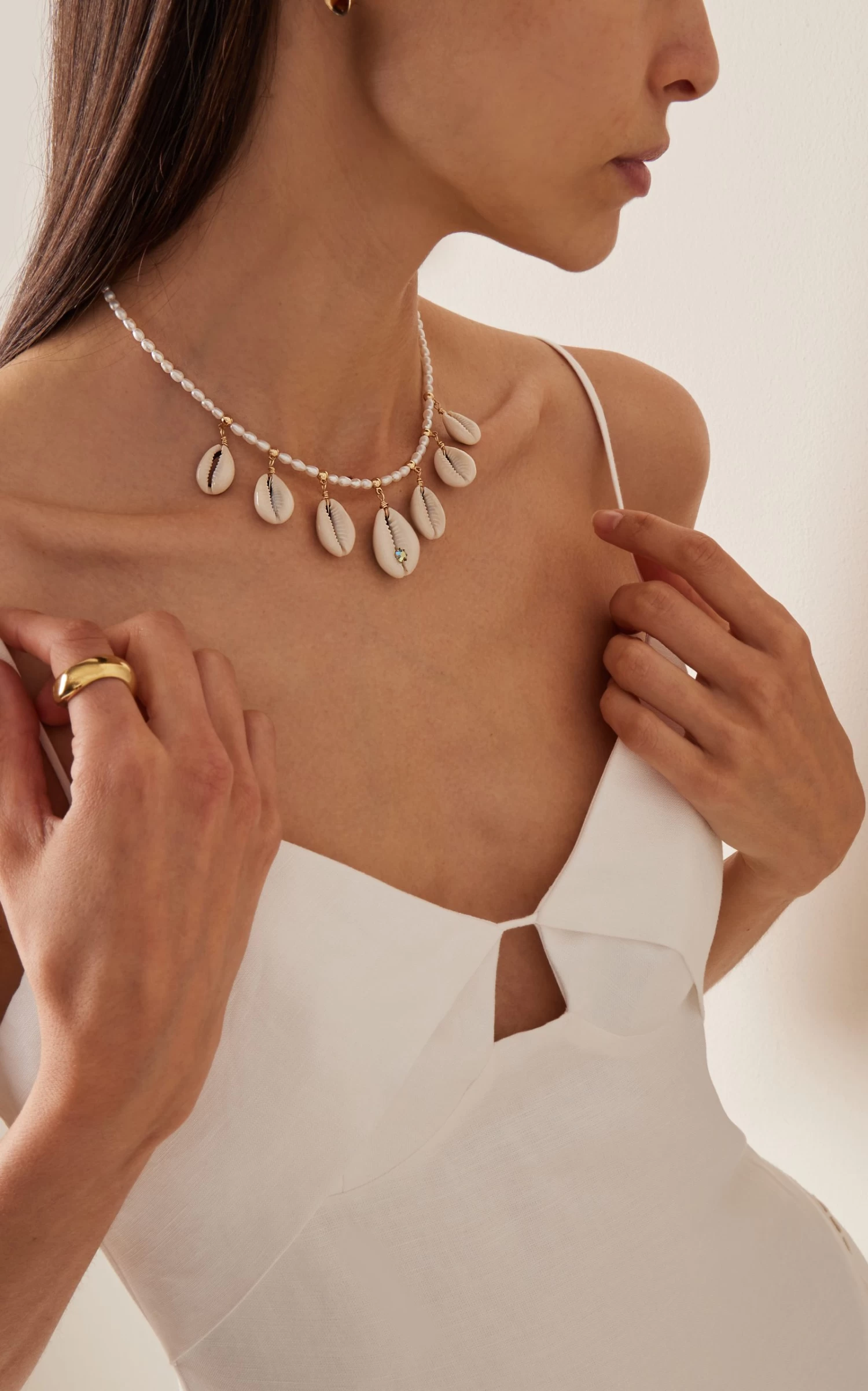 The ‘Miacomet’ is strung with freshwater rice pearls punctuated by cowrie shell charms. Wear yours layered.