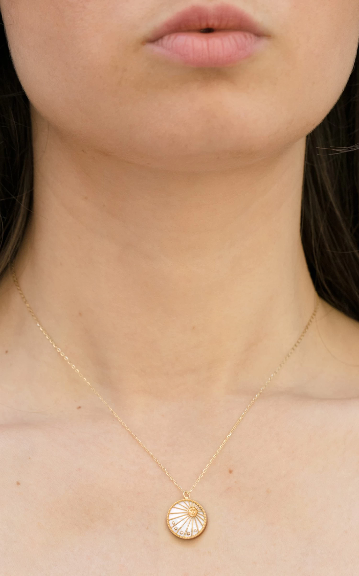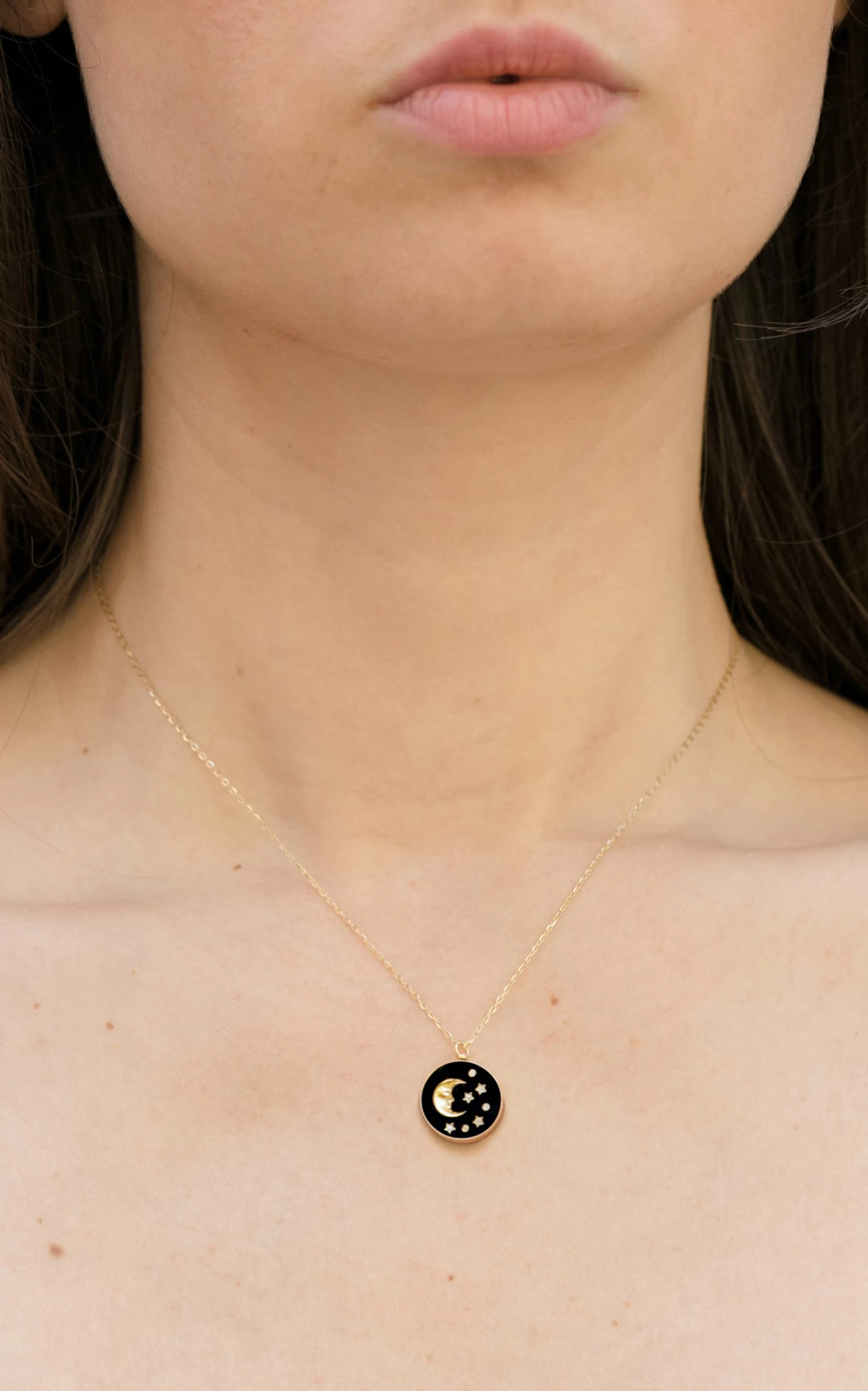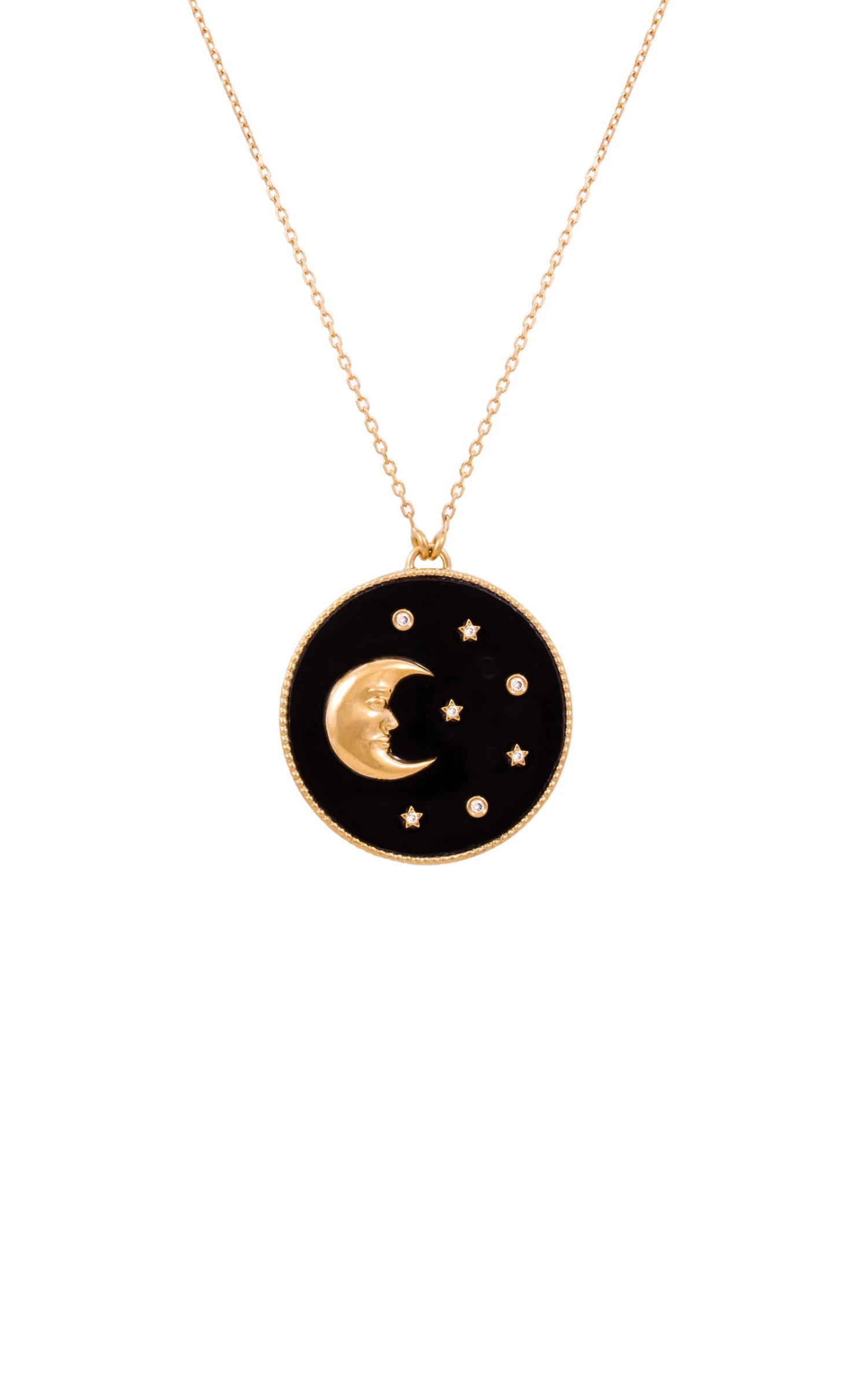 This ‘Mini Day and Night’ pendant is hand carved from an iridescent mother of pearl and an onyx stone encrusted with 0.25 carats of white diamonds.