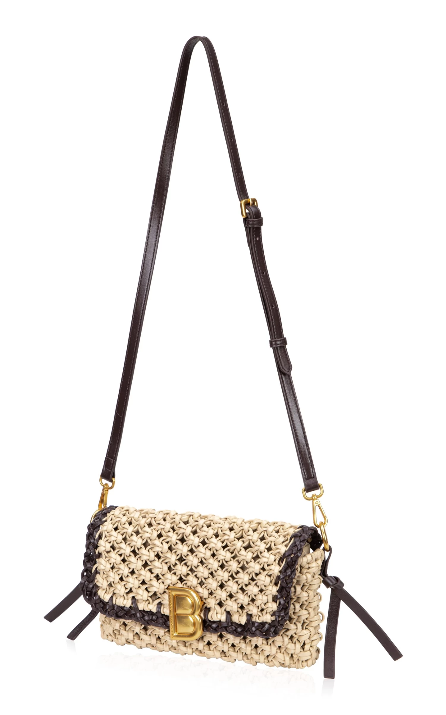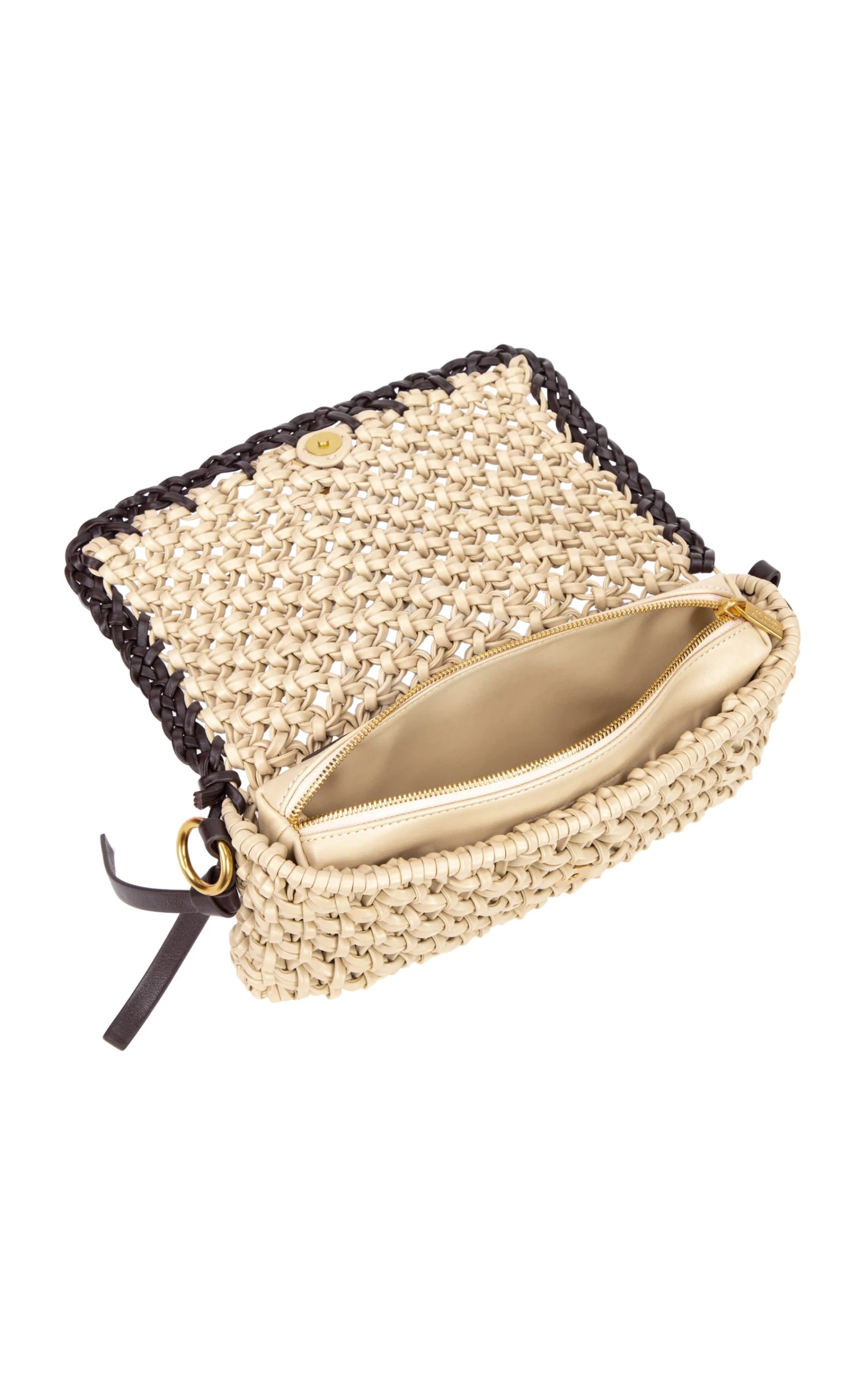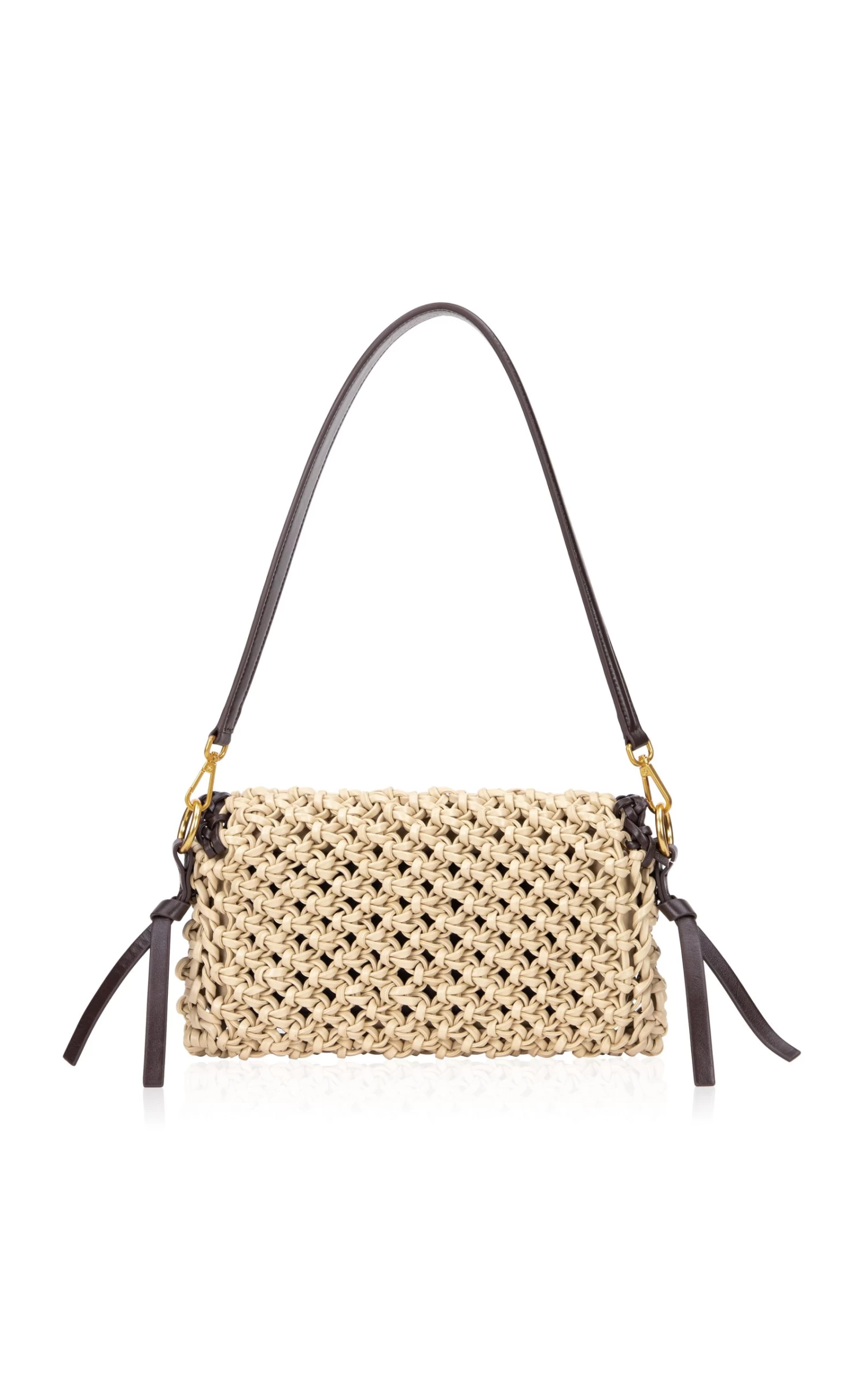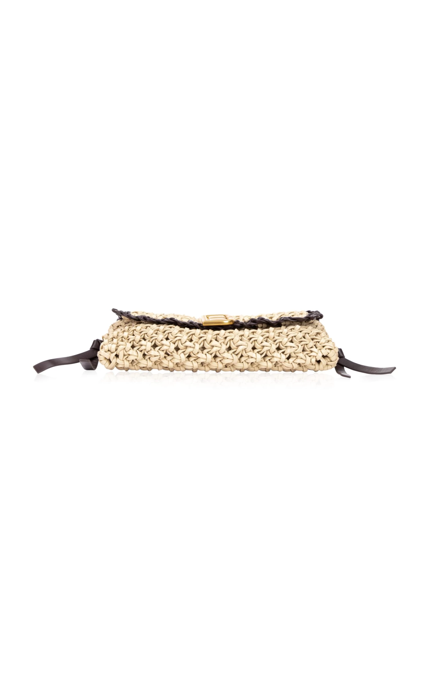 - Elongated shoulder bag silhouette, woven leather body, knitted design, gold-tone logo detailing at closure, removable shoulder & crossbody strap for clutch option, fully lined
