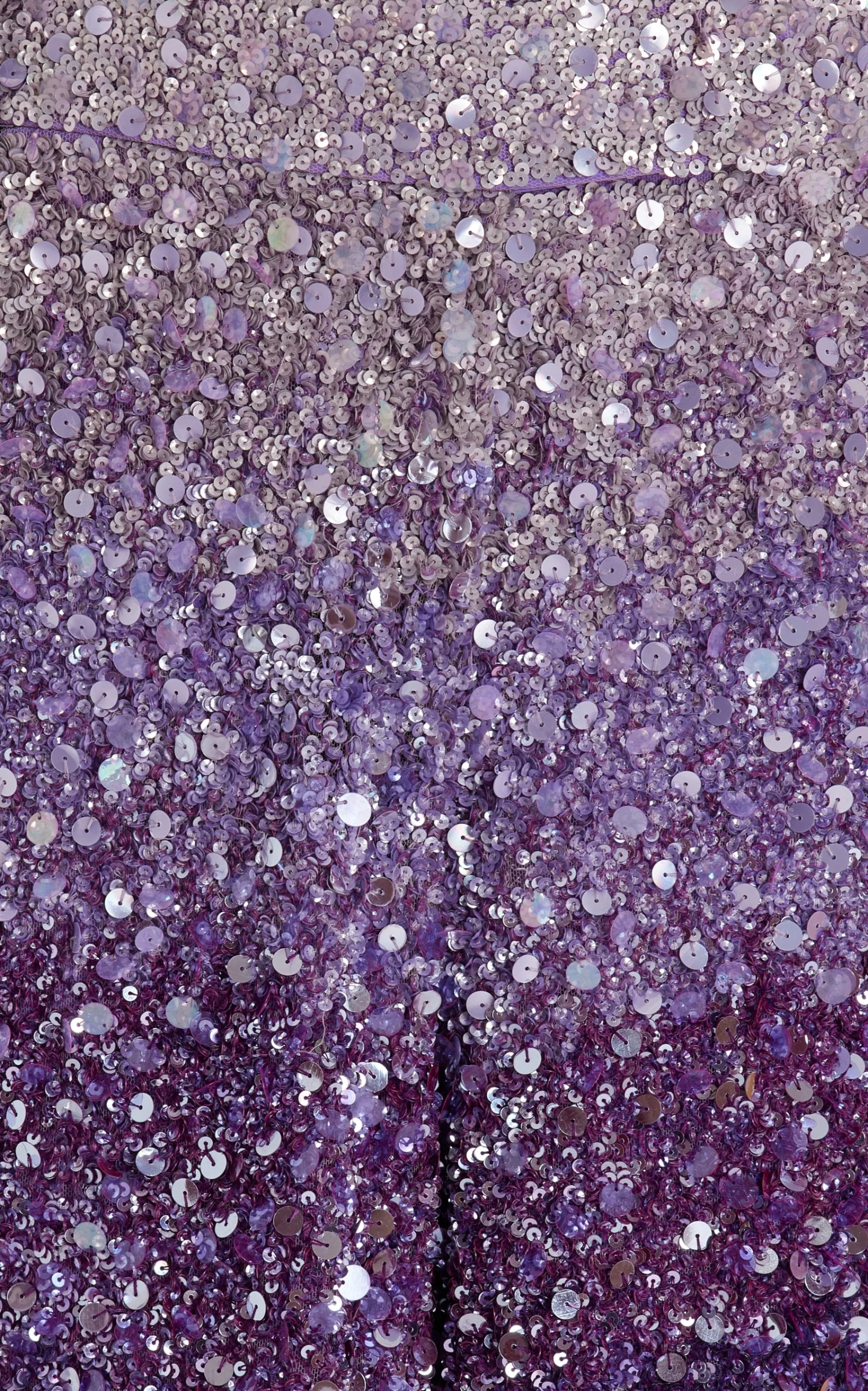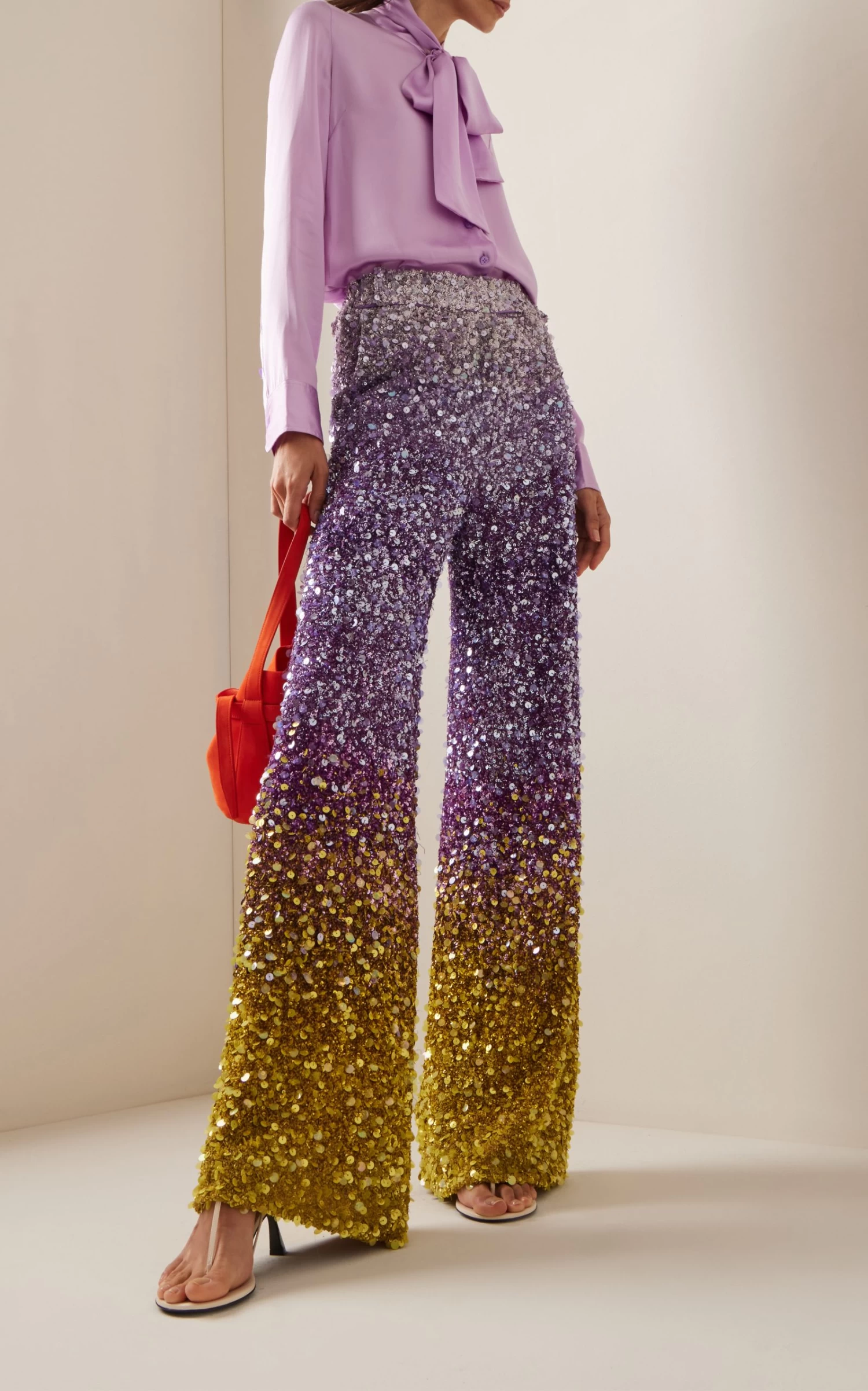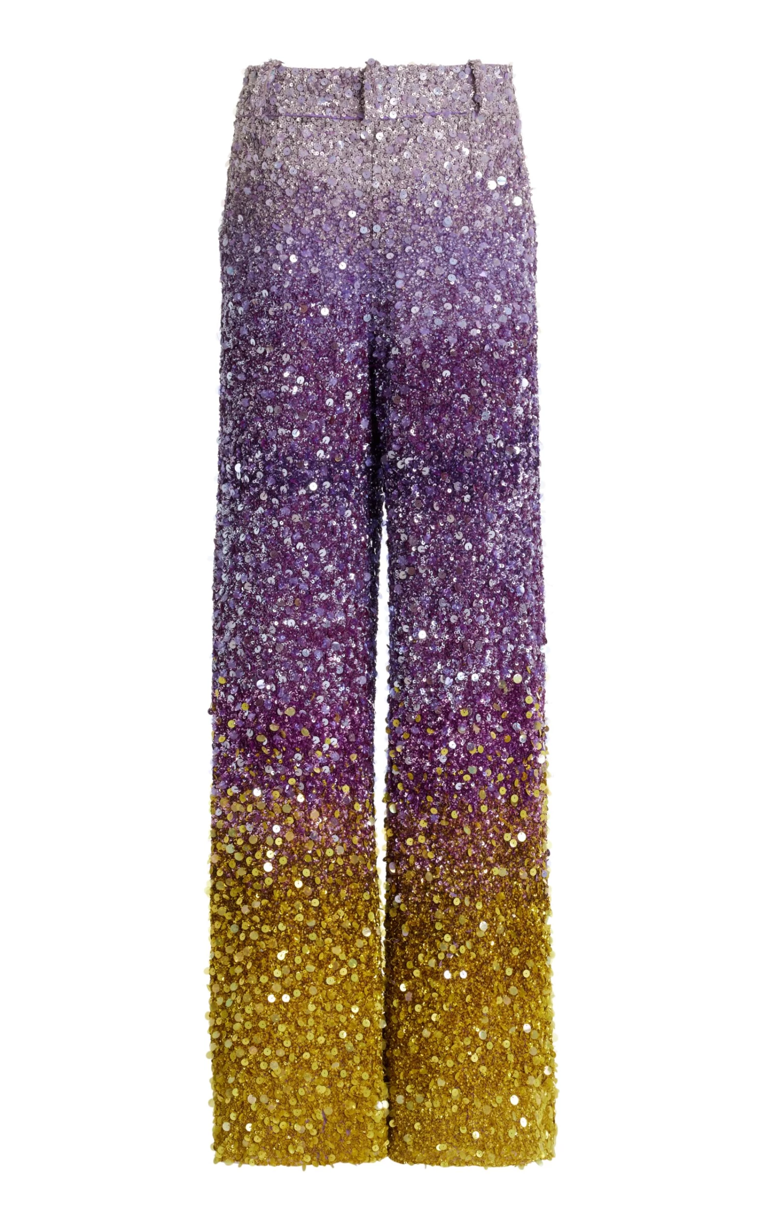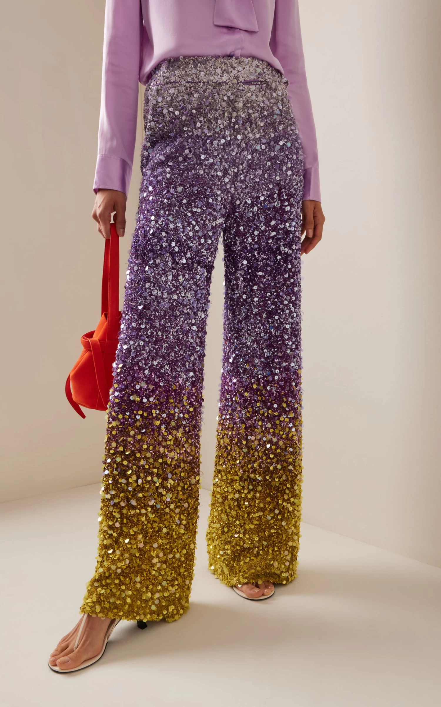 A stunning array of shimmering sequins, these pants boast on ombre design and a high-waisted, wide-leg silhouette. Style with the matching coat for ultimate statement dressing.