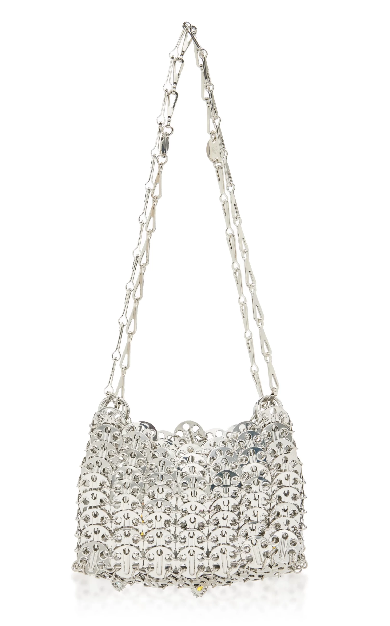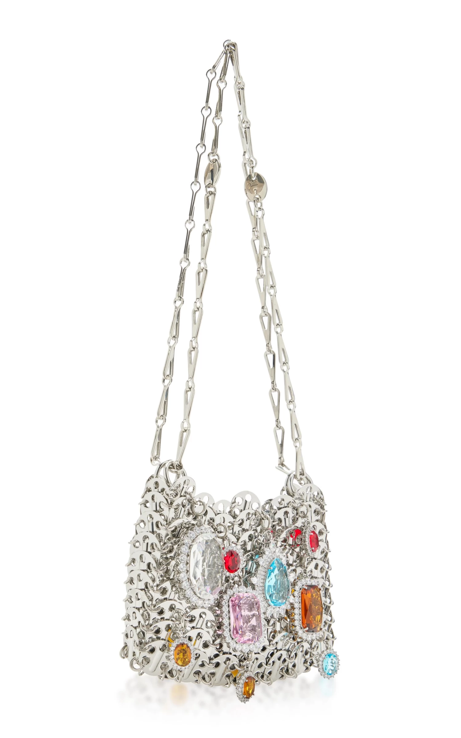 The ‘1969 Nano’ style features the label’s signature chainmail construction updated with gemstones and crystals. The chain strap can be doubled or worn longer to style crossbody.