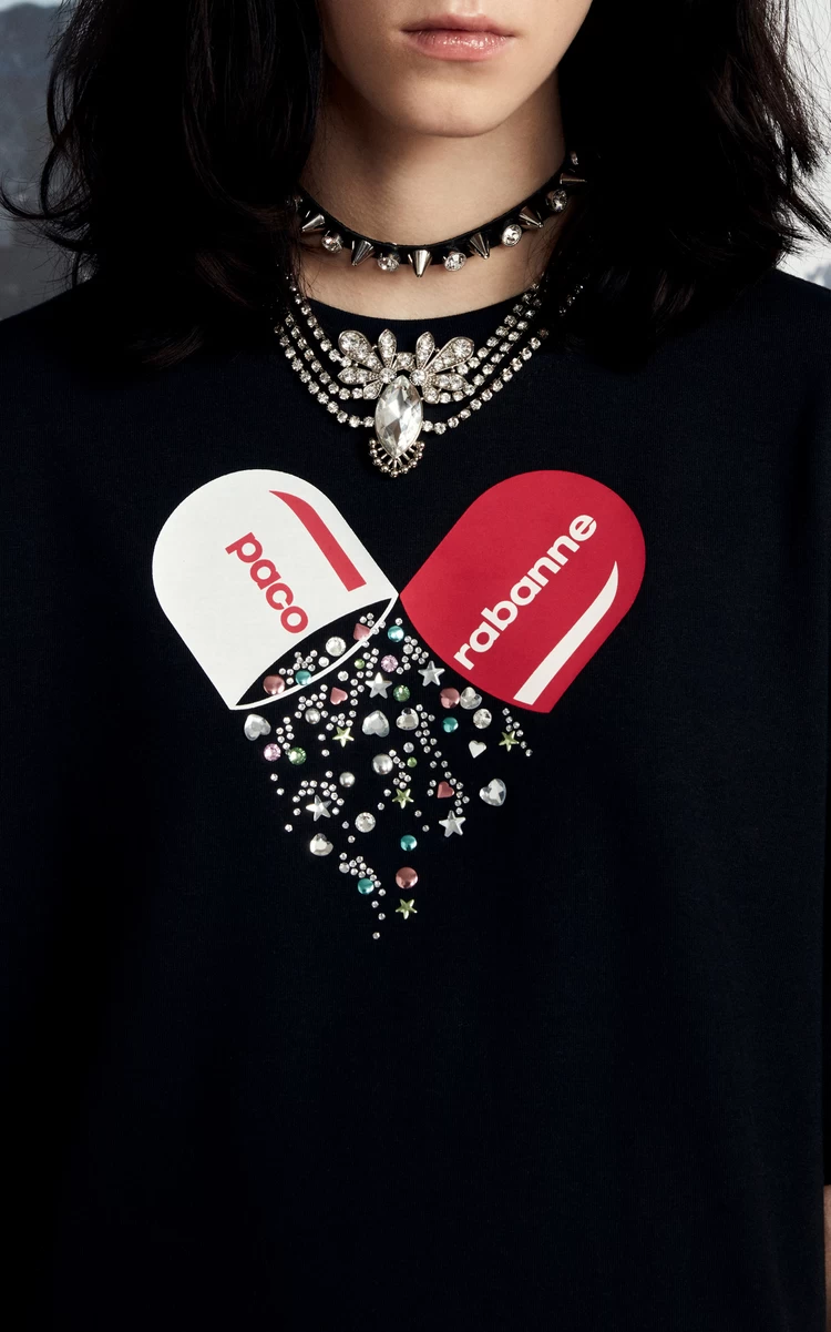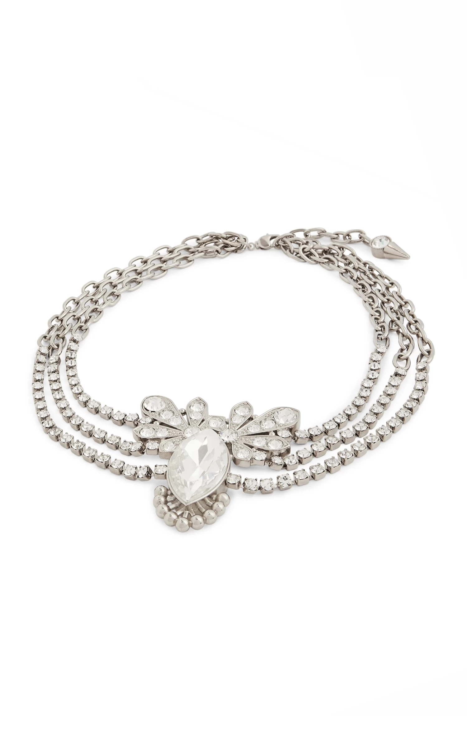 This statement choker has a silver-tone brass chain-link body decorated with glass crystals and a large crystal embellished pendant. Pair with anything, from a Paco Rabanne tee to evening wear, for a touch of glamor.