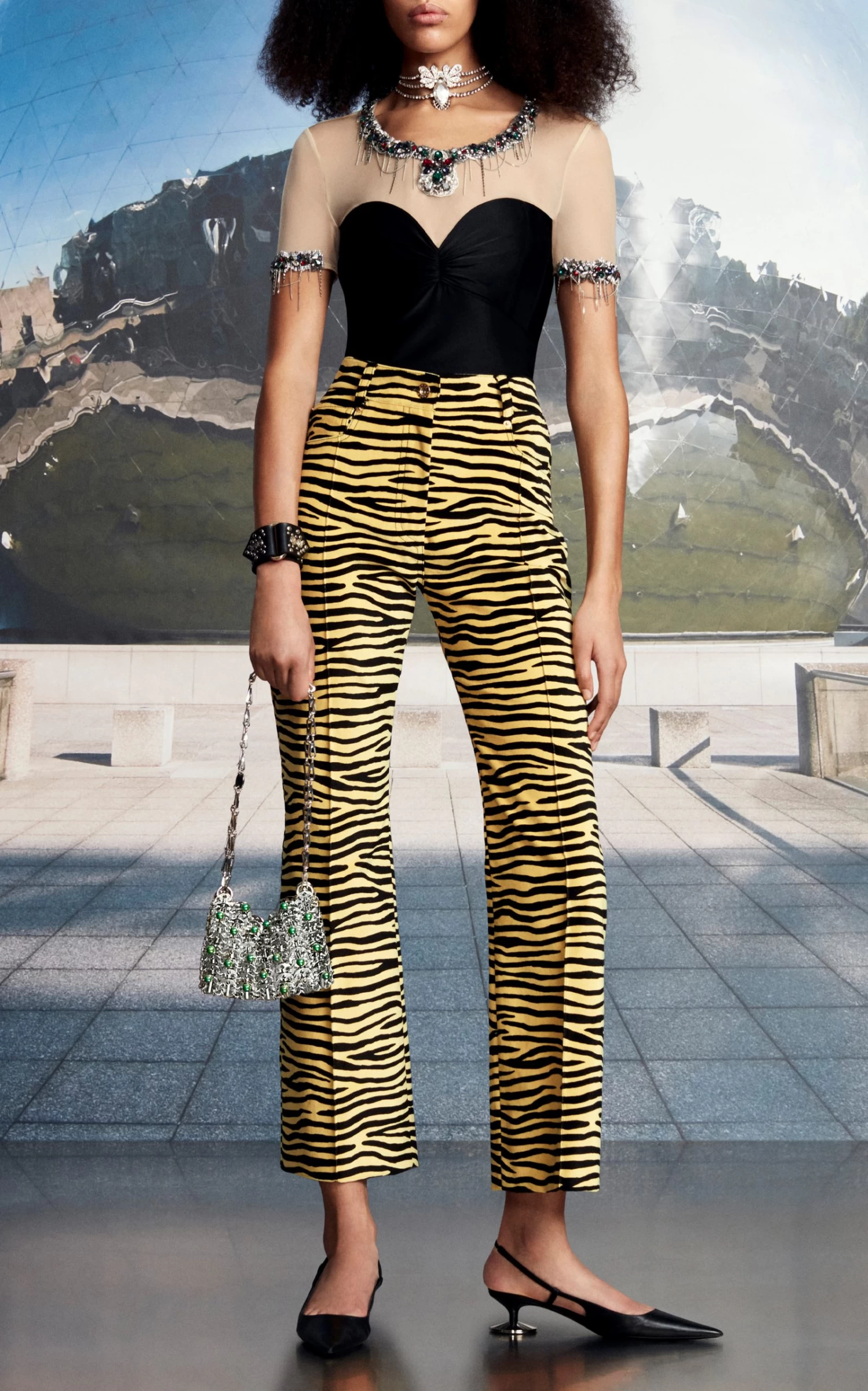 Entering his 10th year at the helm of the French house, Julien Dossena hones and updates his past hits—while setting the stage for his Fall ’23 runway. Channeling the effervescence and sizzling nightlife of 1980 Paris are playful juxtapositions—from sharp, zebra-printed tailoring paired with crystal-strewn trompe l’oeil bustiers to metal mesh teamed with khaki cargos or a Fair Isle knit.