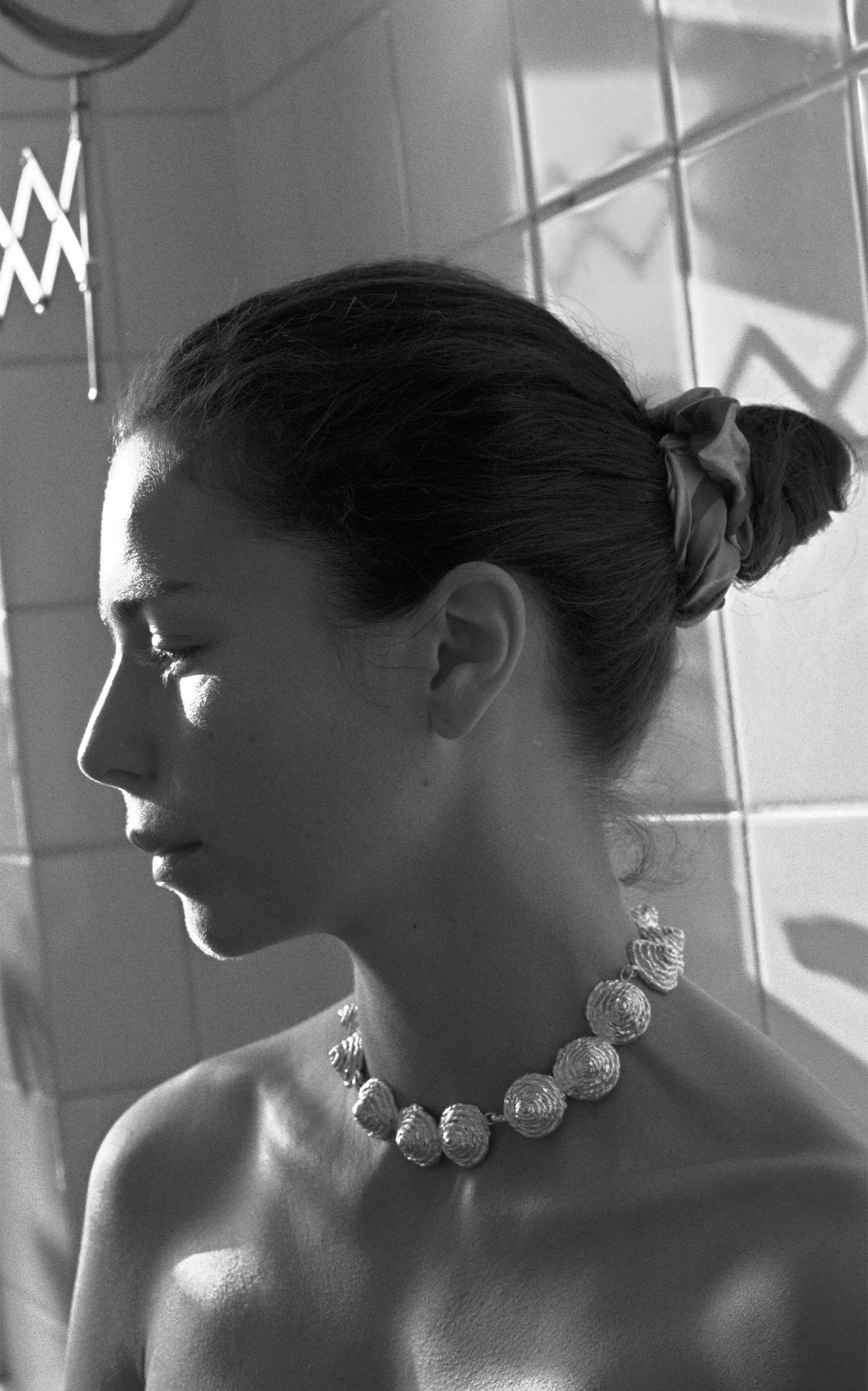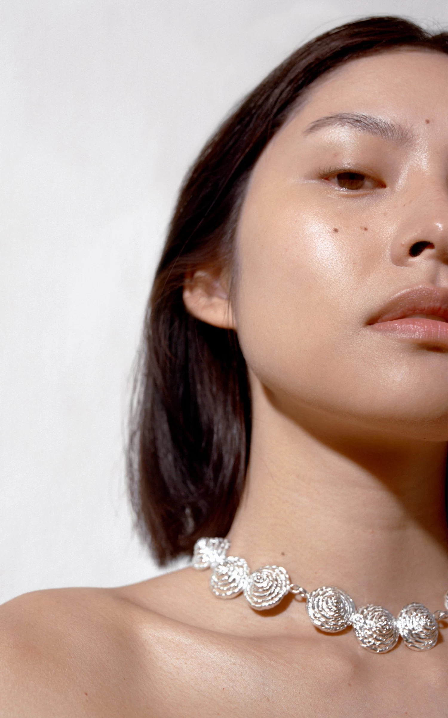 - Collar silhouette, sterling silver body, circular textured design, handmade in Copenhagen