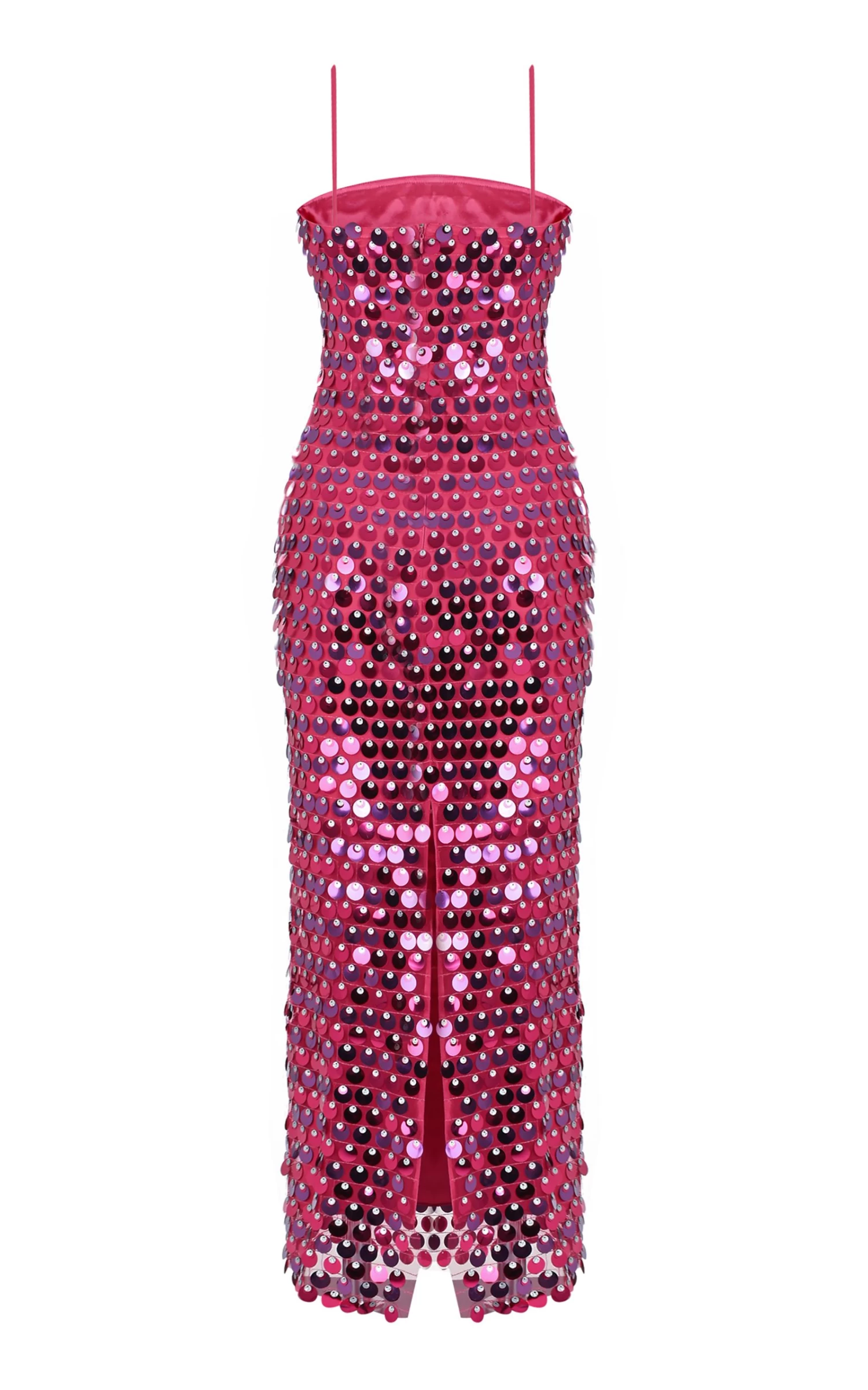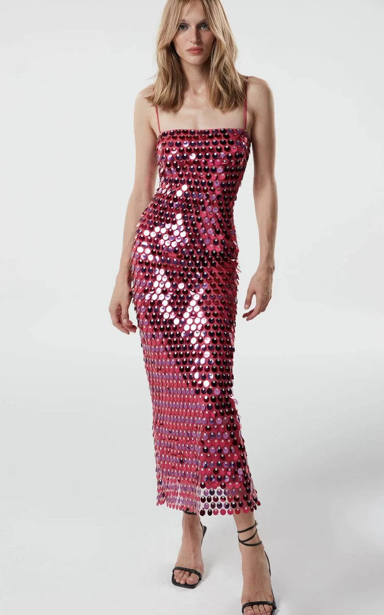 - Sqaure neckline, spaghetti straps, sequin embroidery, Lined