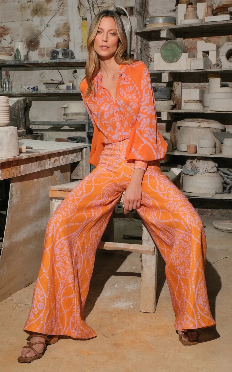 For Pre-Fall, the Colombian talent adorns his signature Latin-flavored femininity with delicate depictions of locally made tableware. Romantic tile-like patterns, a decorative plate print, and intricate mosaics that—along with beloved, mood-boosting florals—elevate the designer’s cinched-waist, full-skirted silhouettes, and glamorous separates to stunning new heights.