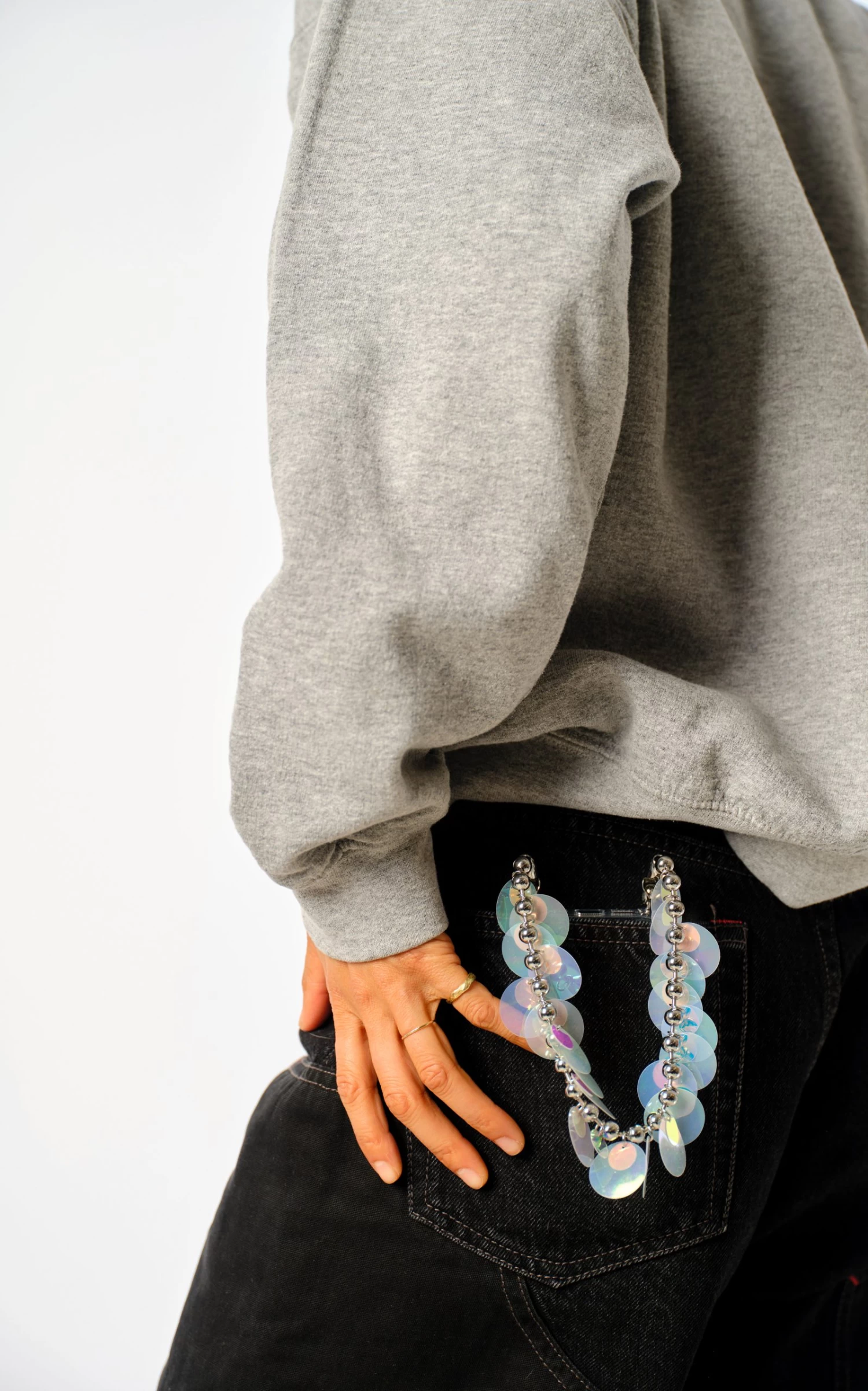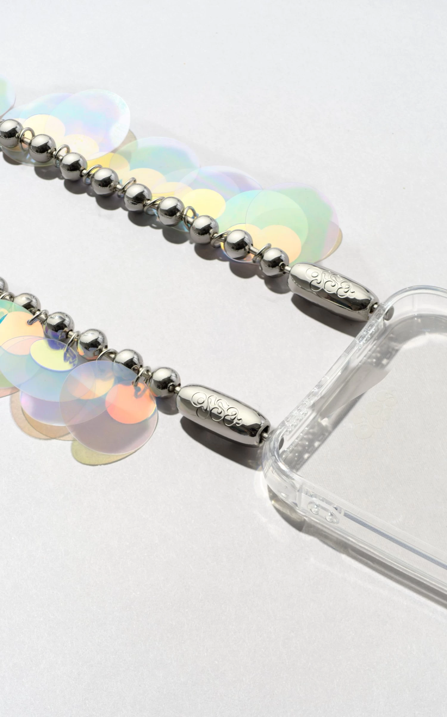 This wristlet style is made from iridescent paillettes arranged along a nylon cord attached to an accompanying clear phone case. Marrying style and functionality, keeps your hands free and your phone close with this helpful design.