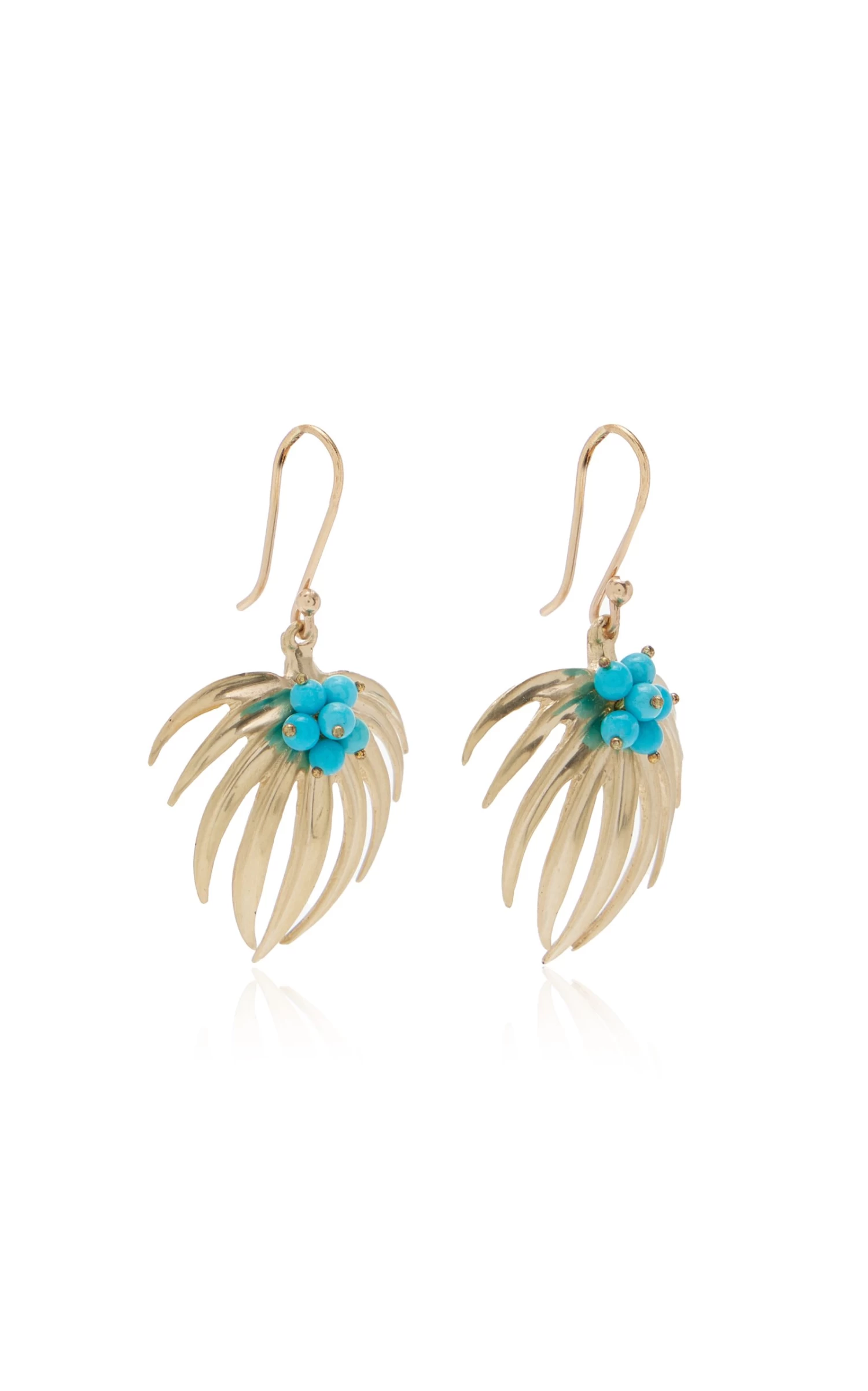Small Curled Fan Palms 14K Yellow Gold Turqoiuse Earrings