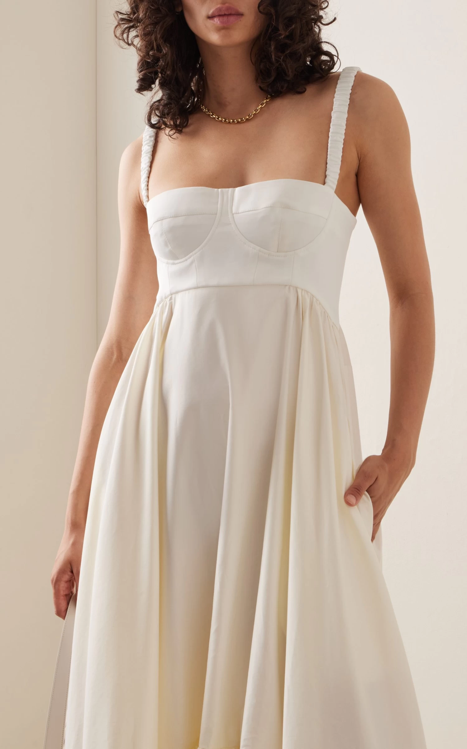 From the ruffled embellishments to the ultra-feminine bustier bodice, Anna October’s maxi dress speaks to the languid nature of summertime. Expertly made from a blend of lightweight cotton, it features a square neckline and full, asymmetric skirt that pairs perfectly with the season’s favorited strappy mules and chunky sandals.