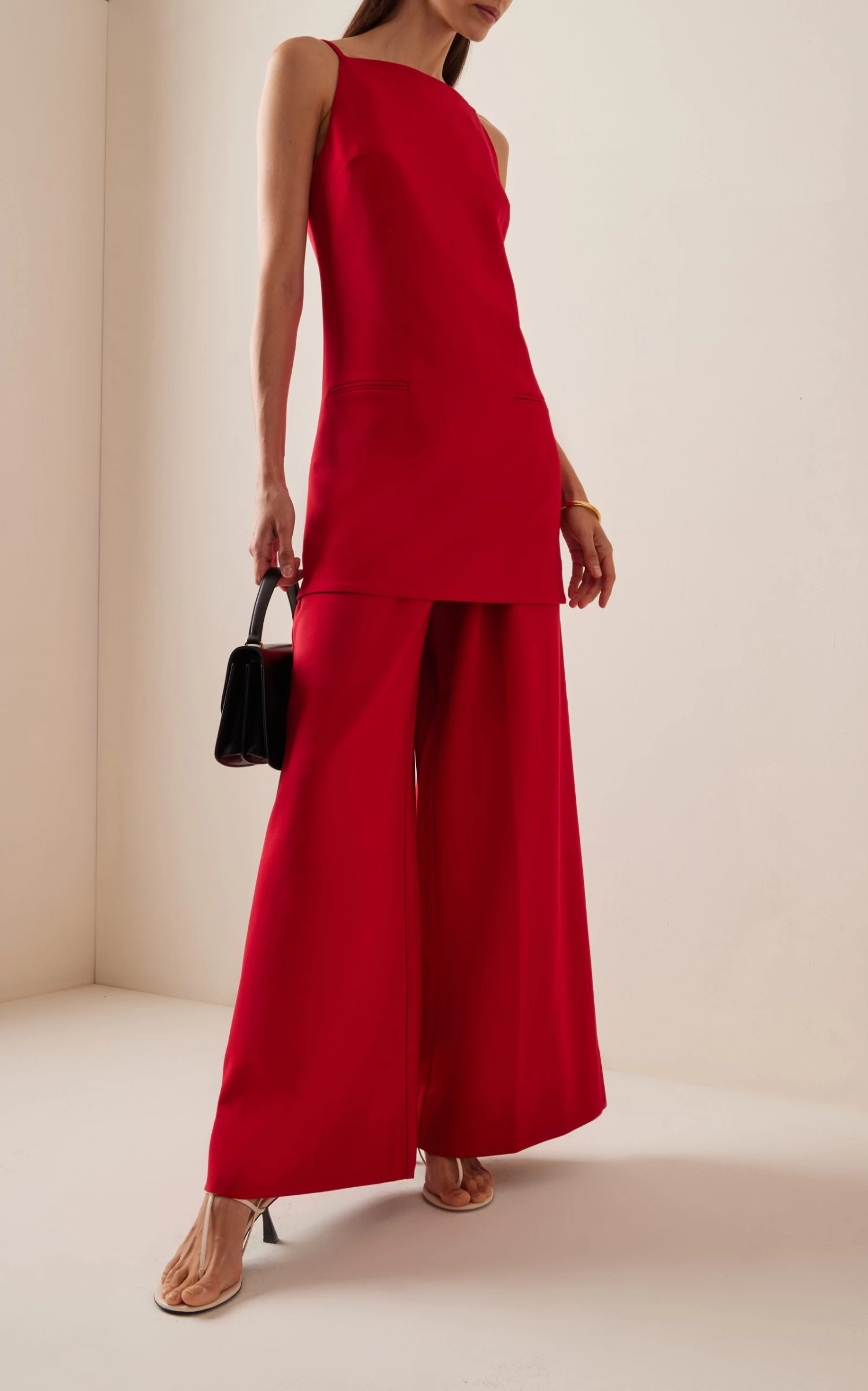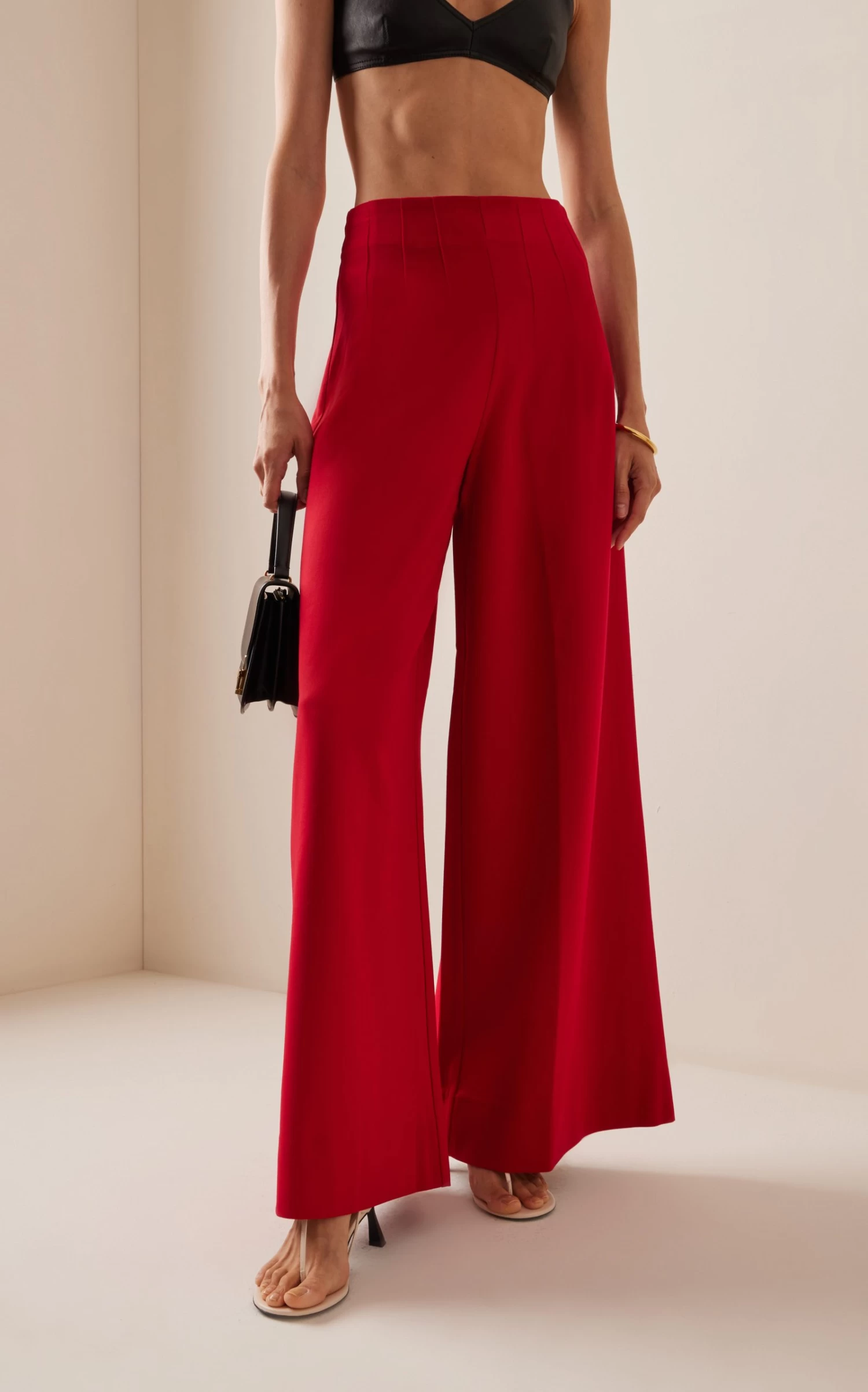 The ‘Caleb’ is a full-length wide leg pant made from fluid crepe with corset seaming along the high-cut waist. It looks great with a billowing blouse tucked in.