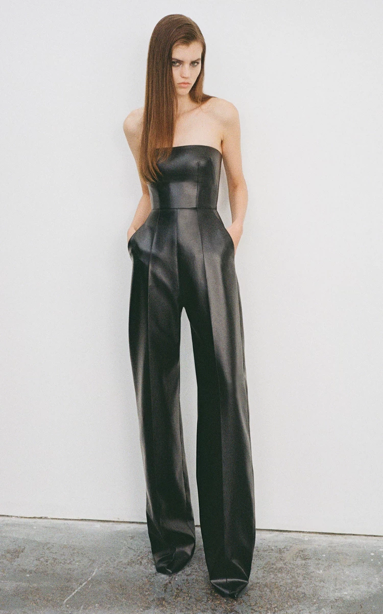 Cut from sleek, polished faux leather, the ‘Steele’ jumpsuit has a strapless, fitted A-line silhouette detailed by a pleated, straight-cut leg and dual pockets. Style with a neutral pump and a clutch for your next evening out.