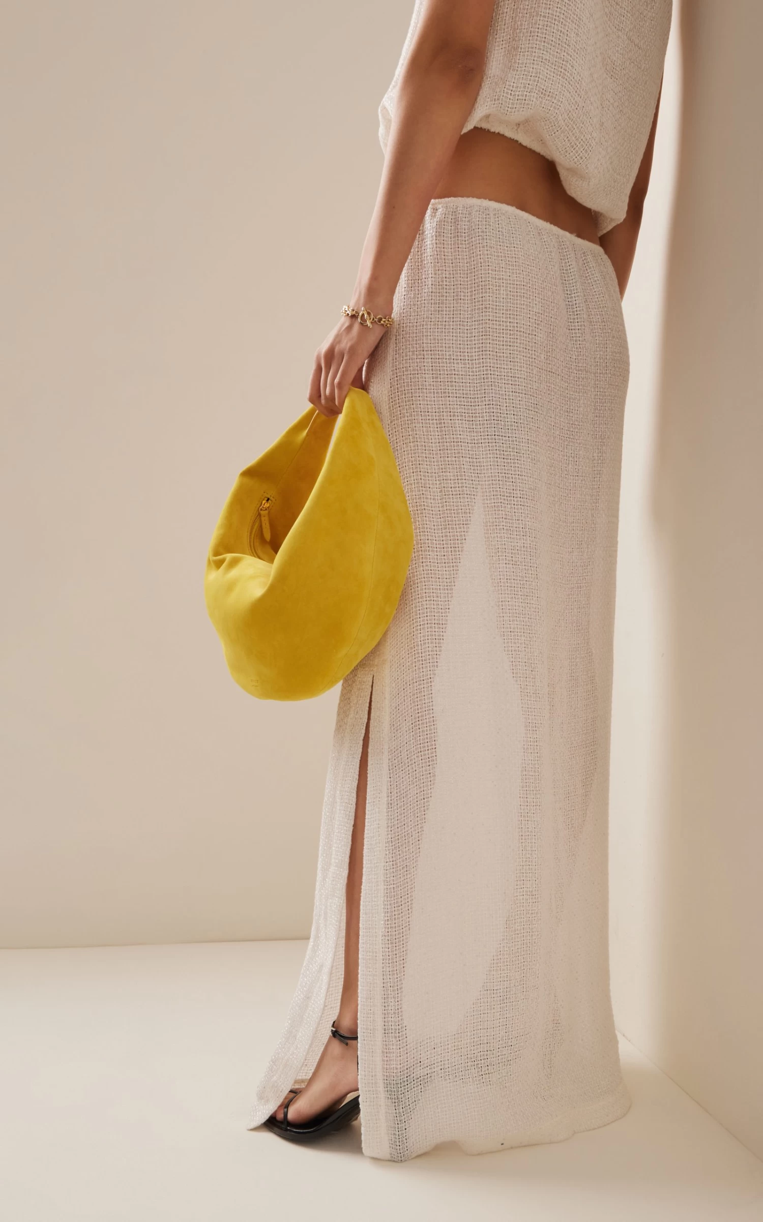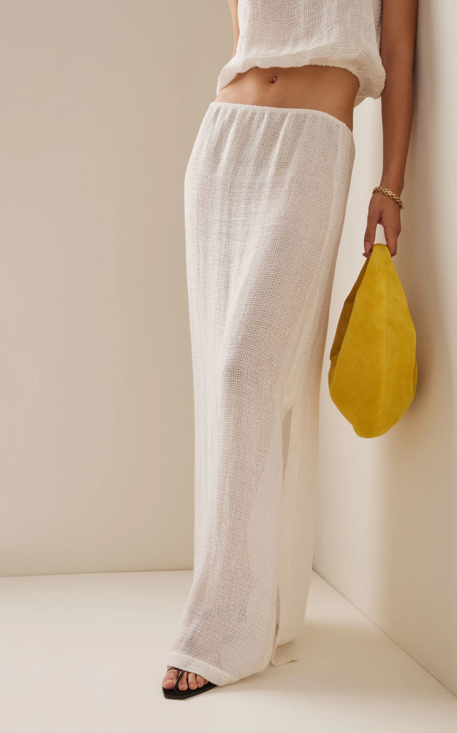 Slightly gathered along the waistline, this linen blend maxi skirt is slightly sheer with a relaxed fit. Wear with the matching top to complete the full look.