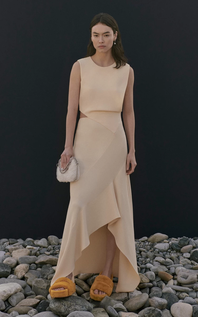 - A-line cut, round neckline, sleeveless, cutout detail, asymmetric high-low maxi skirt