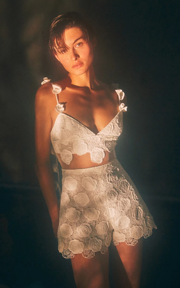 - Floral appliquéd straps, sheer embroidery, cutout waist