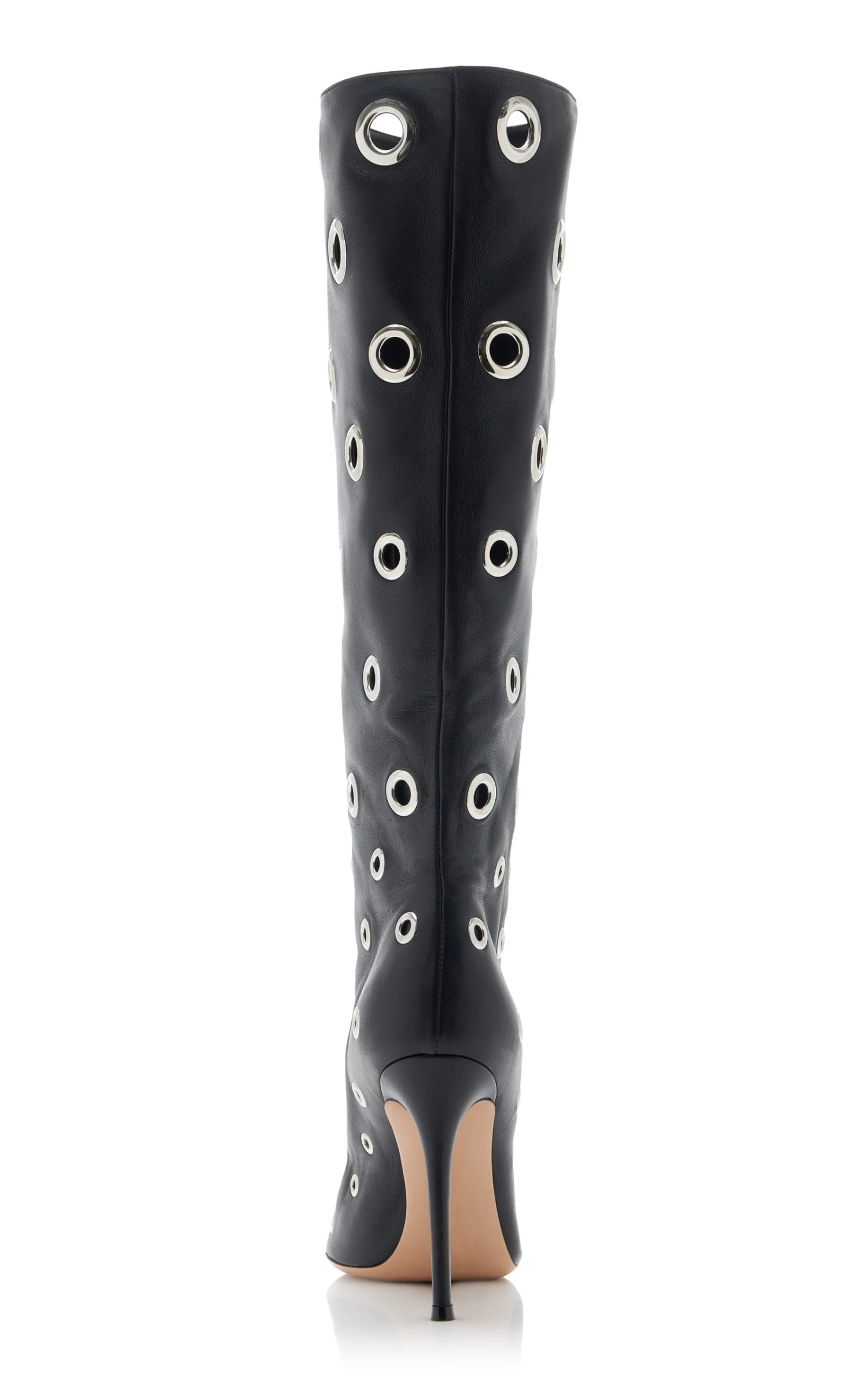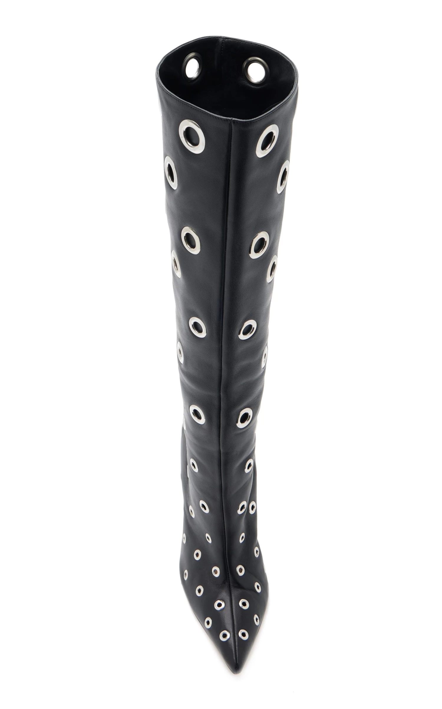 Set on a stiletto heel, these boots have a knee-high silhouette made from grommet-embellished leather with sharply pointed toes. Wear yours with mini hemlines.