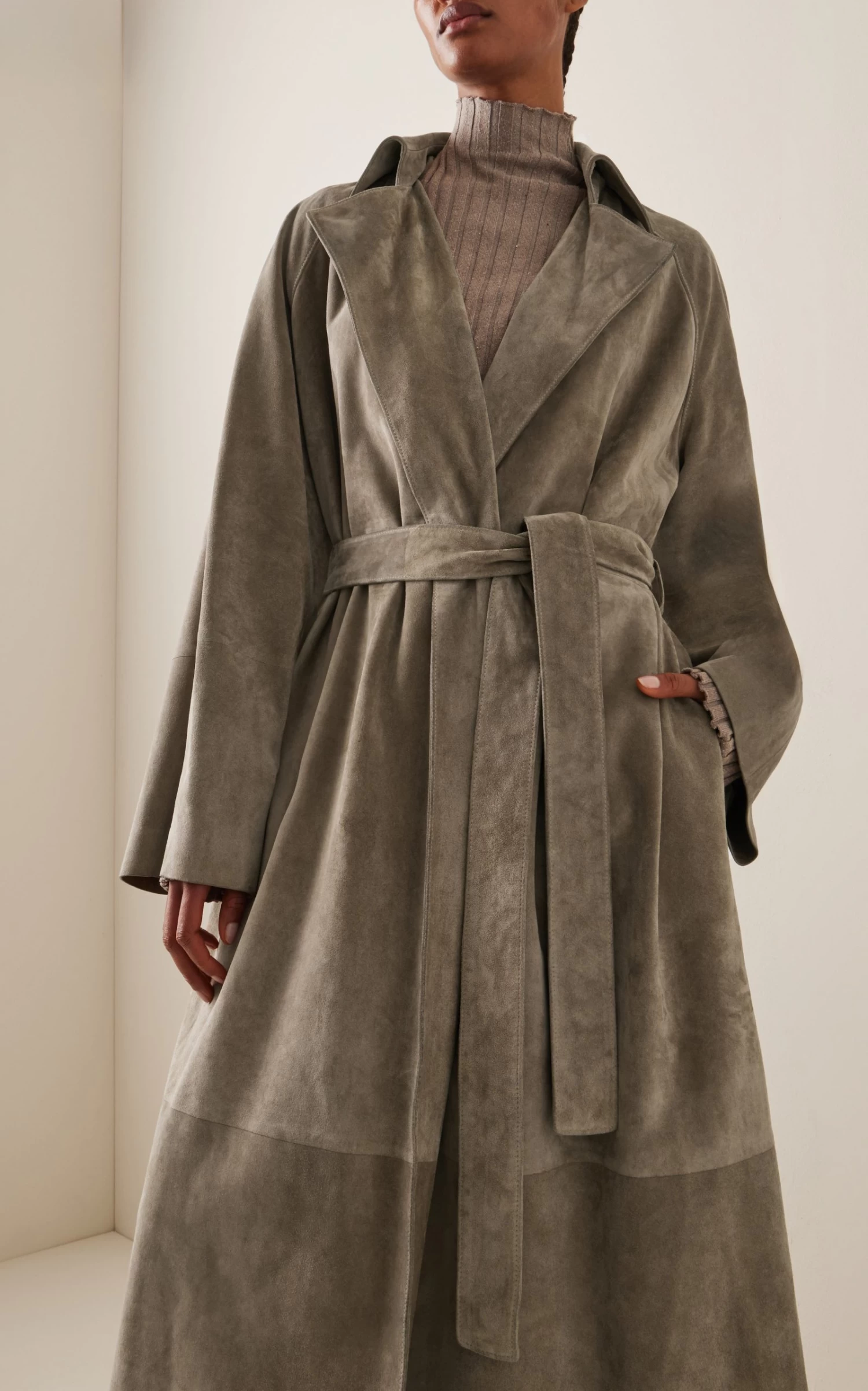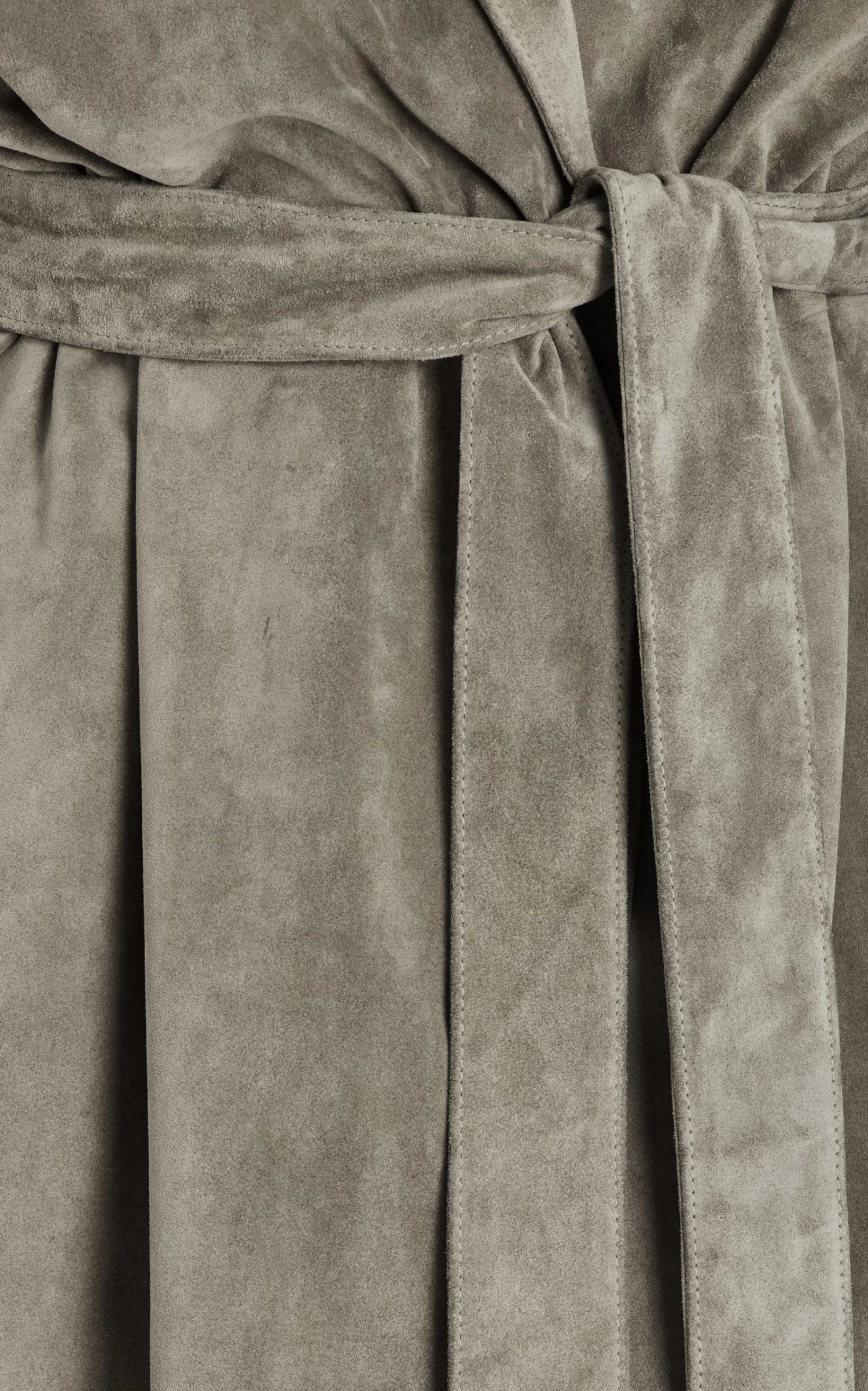 The ” is a long belted coat made from heavy sueded leather with central back vent and silk-lined side pockets.