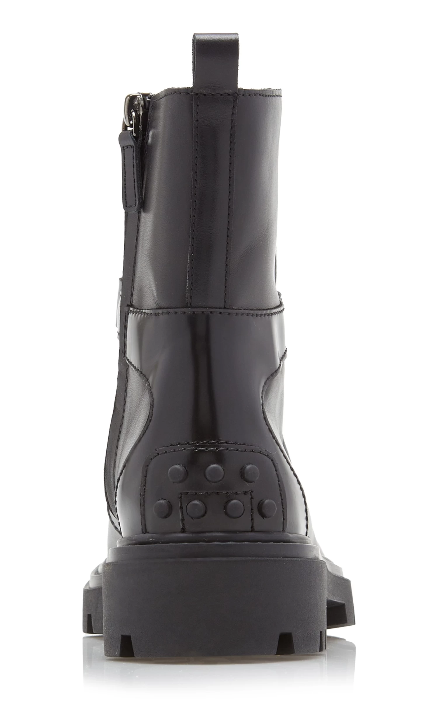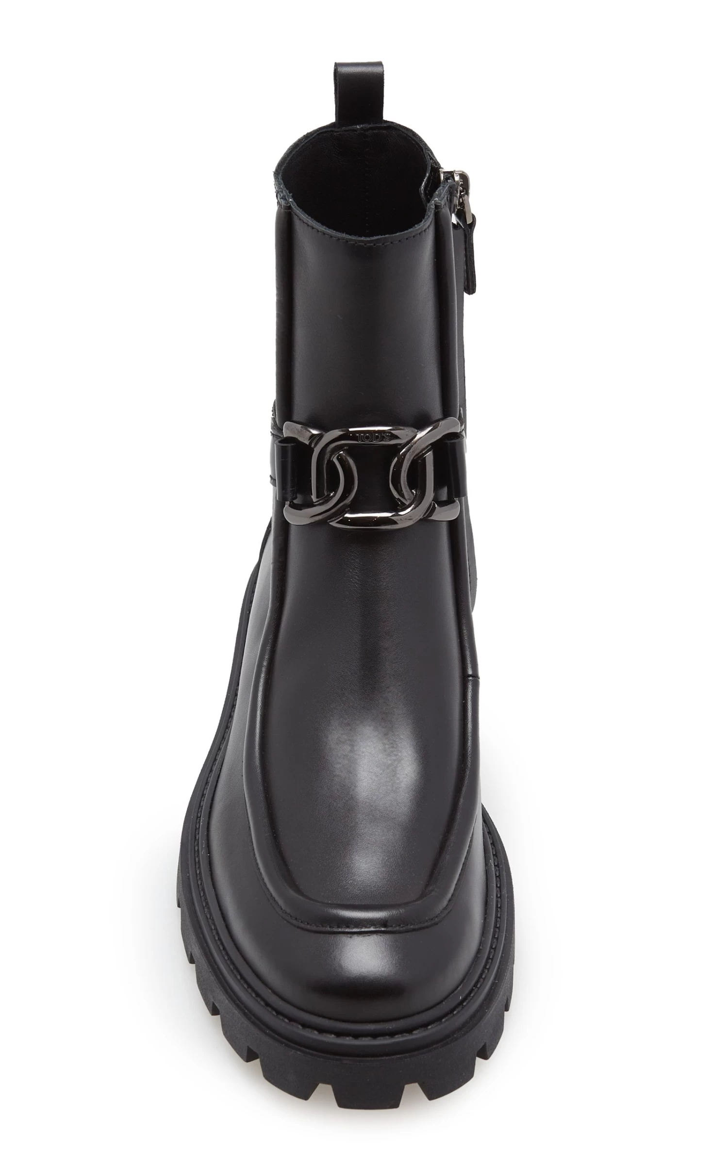 - Ankle boot silhouette, leather body, branded metal chain accessory, rubberized detailing on the heel, rubber lugged outsole, rounded toe
