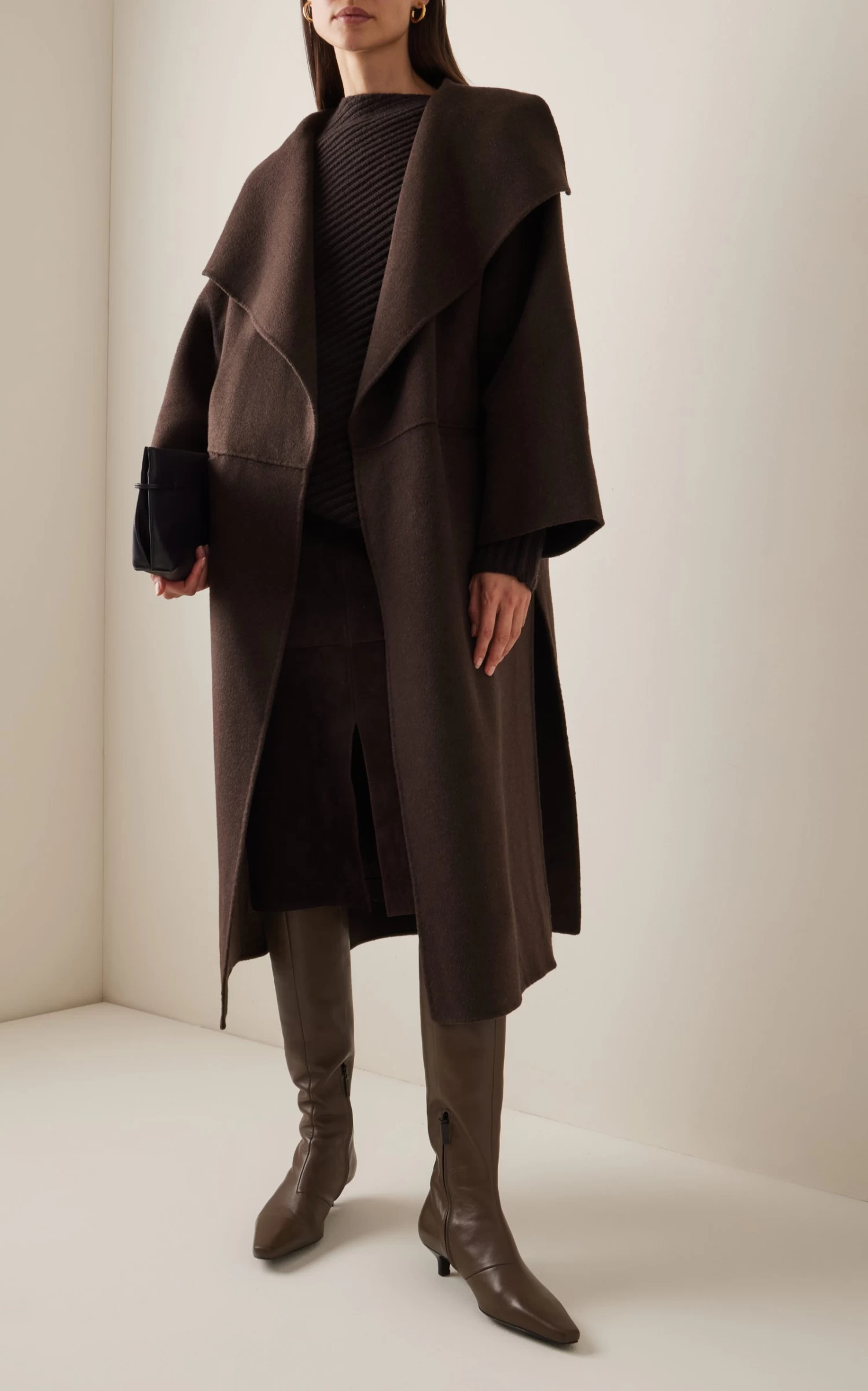 A brand signature, this coat is made from soft doublé fabric — a blend of responsibly sourced wool and cashmere that’s created by hand-stitching two fine layers together to achieve a double-faced finish with clean seams. It has an oversized silhouette with easy-to-style shawl lapels, dropped shoulders, and an open front which makes it perfect for layering.