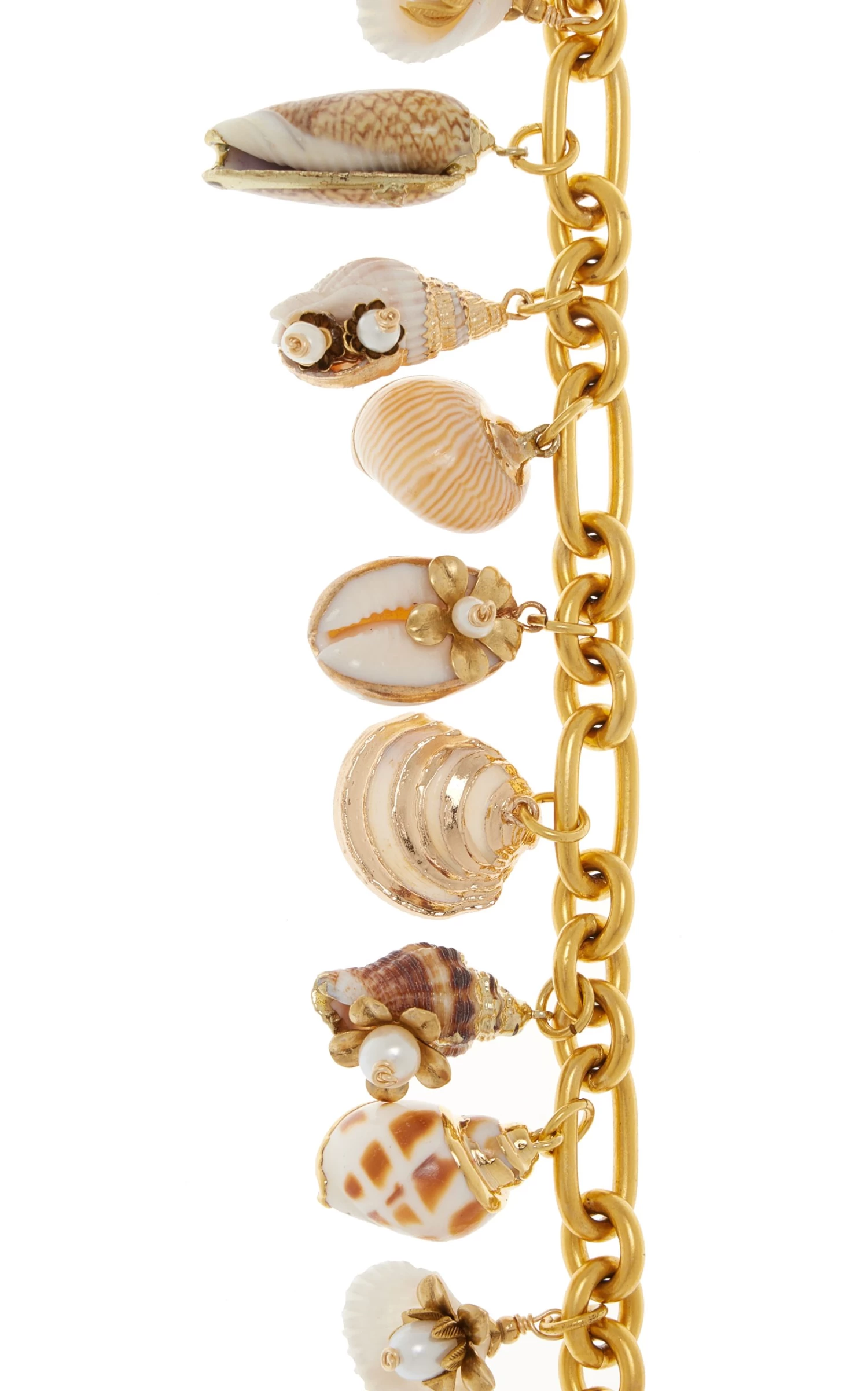 Cast from antiqued 24k gold-plated metal, the ‘Treasure Trove’ bracelet features a chunky chain strung with large shells and baroque freshwater pearls.