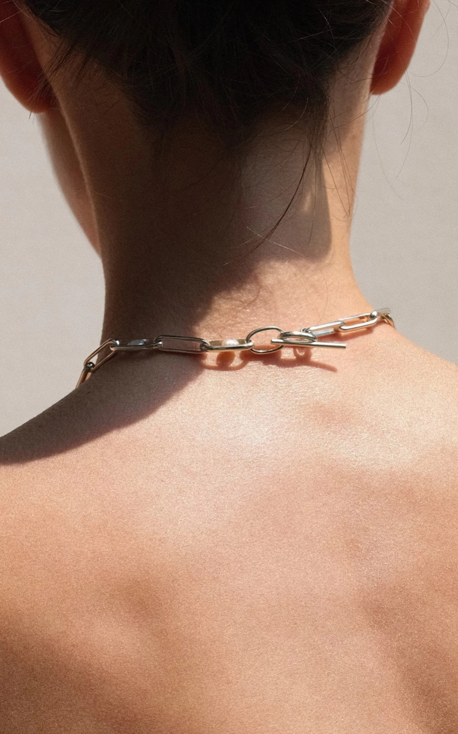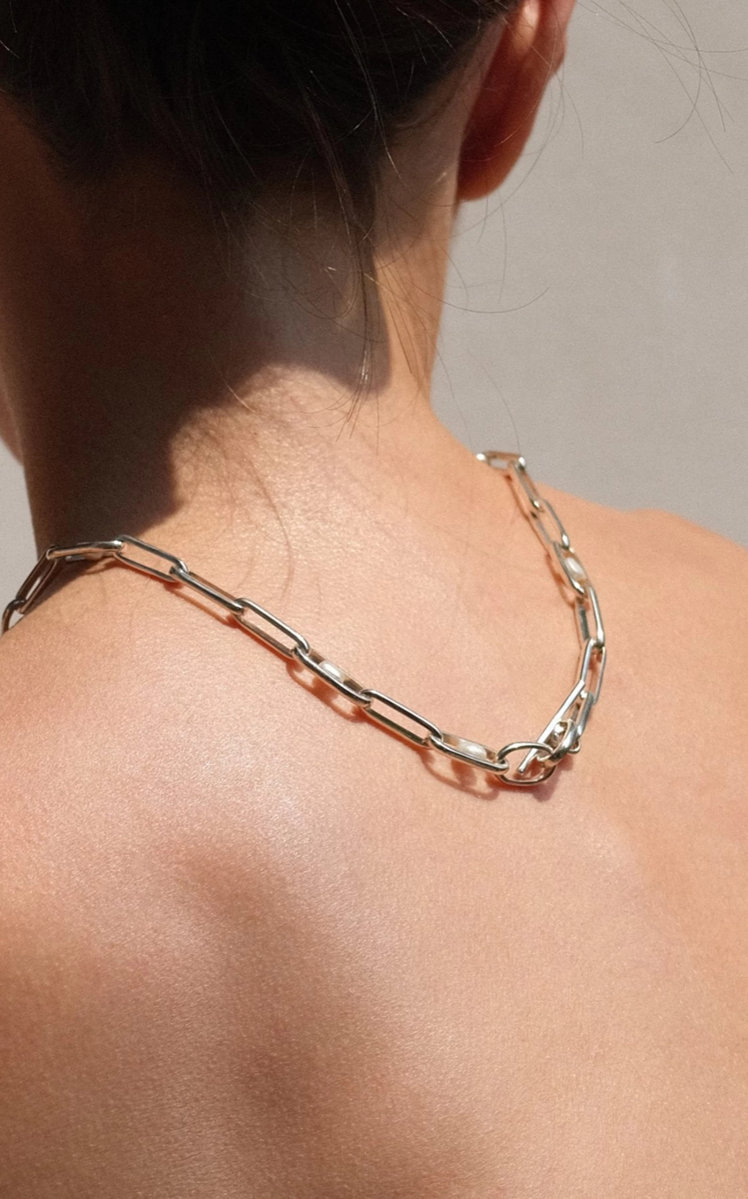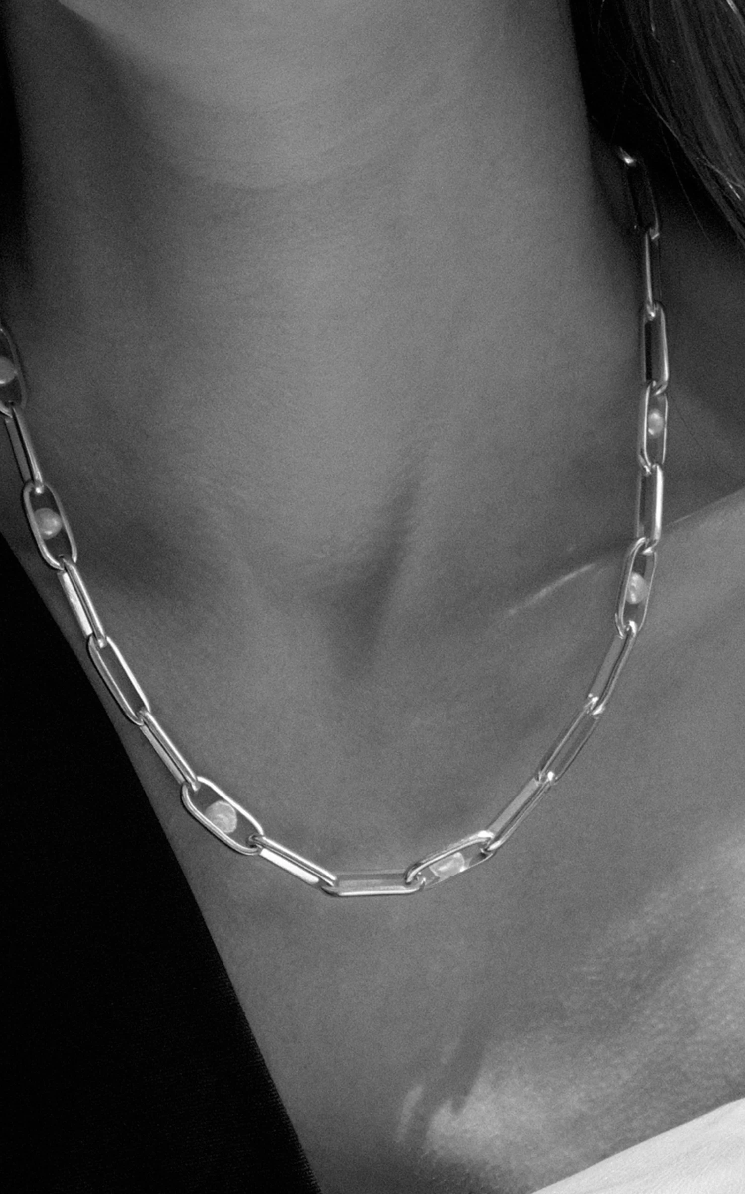 - Collar silhouette, sterling silver body, chain-link design adorned with pearls