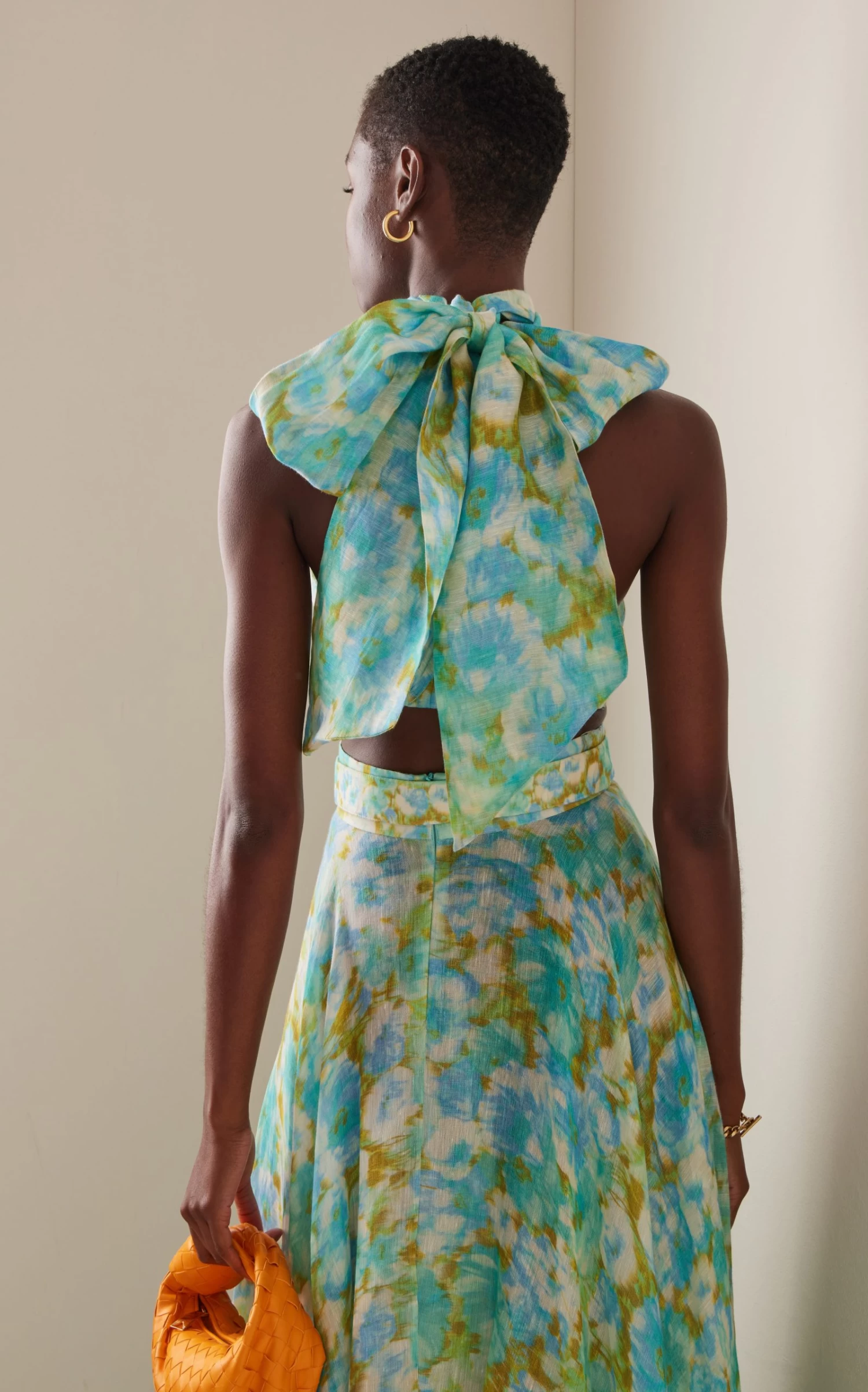 This printed cropped top, made from linen and silk, ties along the back in a large bow. Complete the runway look and pair with the brand’s matching skirt.