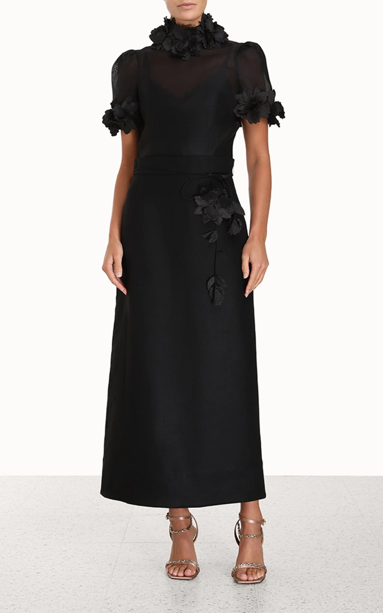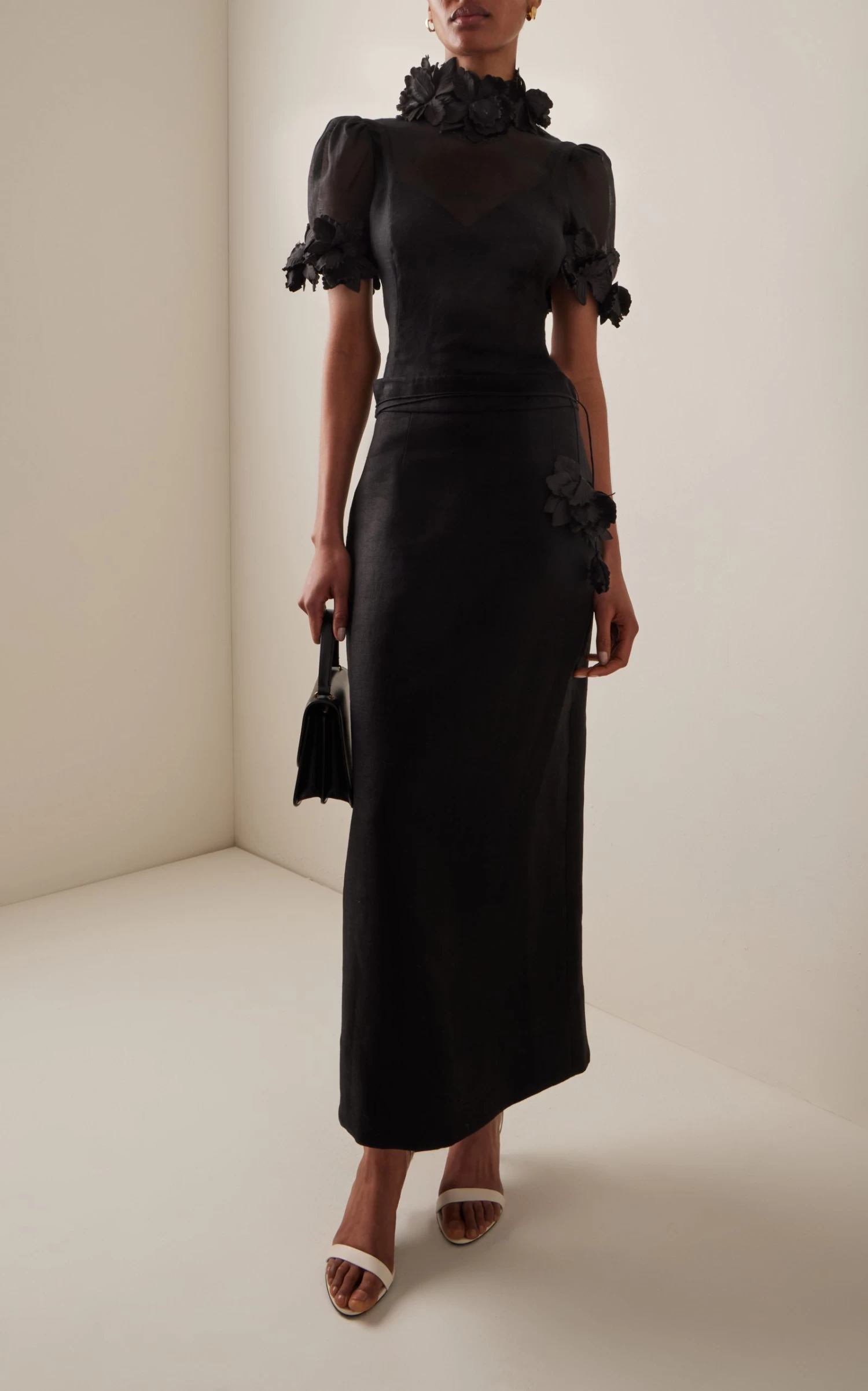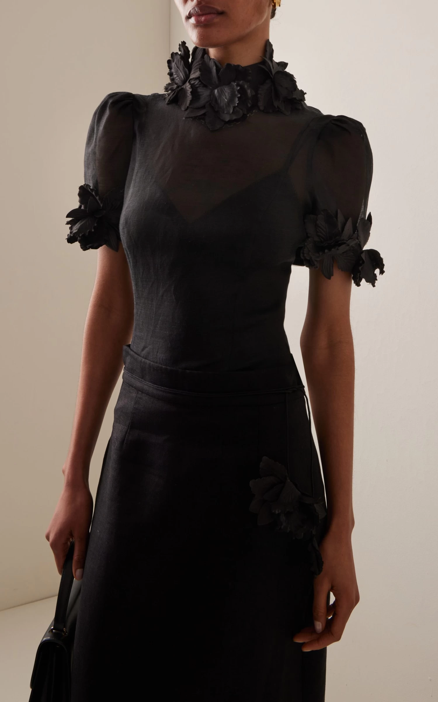 Made of linen and silk, this ‘Luminosity Liftoff’ blouse features 3D floral details and short sleeves. Pair with the matching skirt to complete the look.